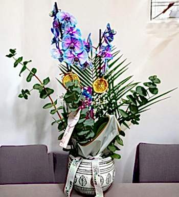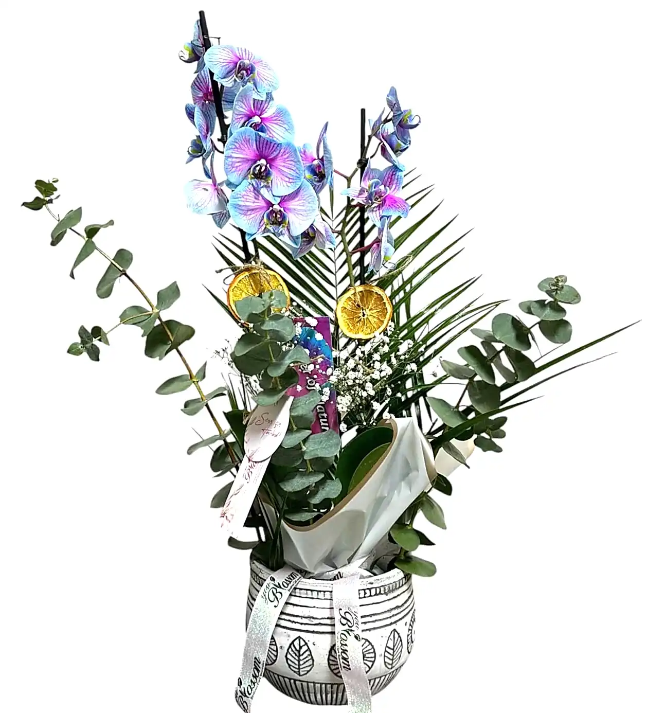 Benzersiz Alacalı Mavi Orkide, doğanın en zarif renk geçişlerine sahip, eşsiz bir çiçektir. Mavi orkidenin mistik güzelliği, antik esintilere sahip dekoratif saksı, okaliptus ve fenix dallarıyla birleşerek botanik bir sanat eseri sunuyor. Orkide çiçeği sevenler için özel tasarım bir aranjman olan bu çiçek, doğallık ve şıklığı bir araya getiriyor.