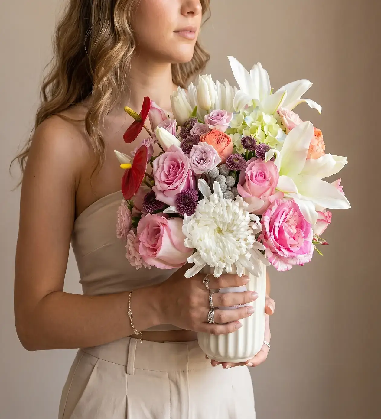 Kalıcı Lüks (Artisan Seramik Vazo): YouBlossom logolu, krem rengi, dikey yivli özel seramik vazo. Çiçeklerin güzelliği anılarda kalırken, bu zarif vazo annenizin evinde kalıcı bir dekoratif obje olarak baş köşeyi süsleyecek.