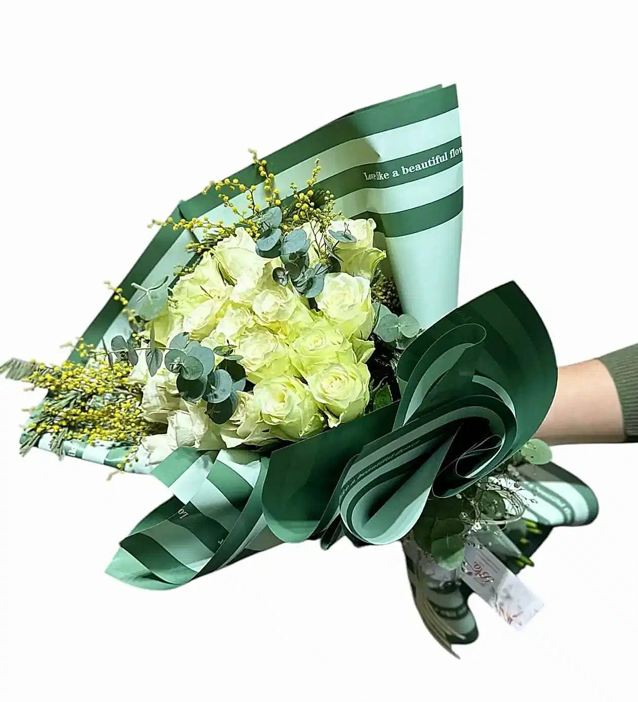 Asil Beyaz Gül Buketi: Okaliptüs Detaylı – YouBlossom Lüks Çiçekler
