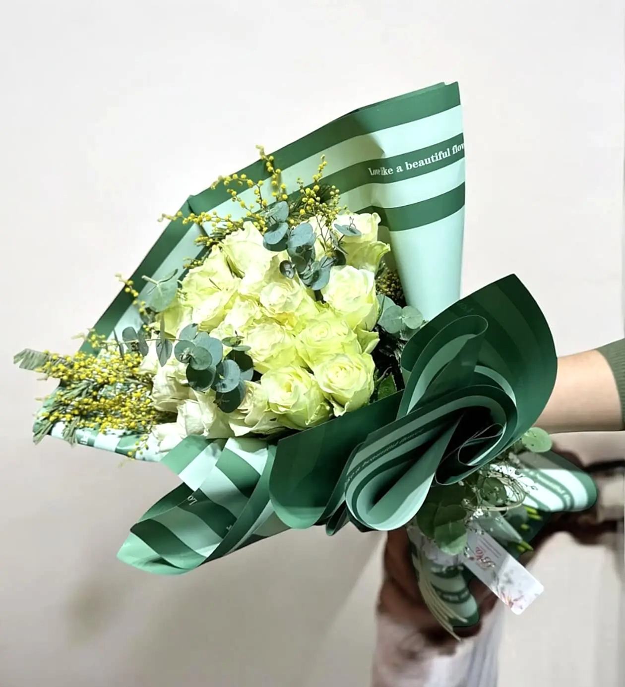 Zarif anlarınızı taçlandırmak için tasarlanmış lüks çiçek buketi ile tanışın: Asil Beyaz Gül Buketi: Okaliptüs Detaylı. Bu eşsiz tasarım, 23 adet saf beyaz gülün büyüleyici güzelliğini, okaliptüs yapraklarının doğal dokusu ve soly (mimosa) çiçeklerinin hafif sarı tonlarıyla birleştiriyor. Her bir detay, doğal çiçek buketi tutkunlarına hitap eden bir sanat eseri gibi özenle hazırlanmıştır.
