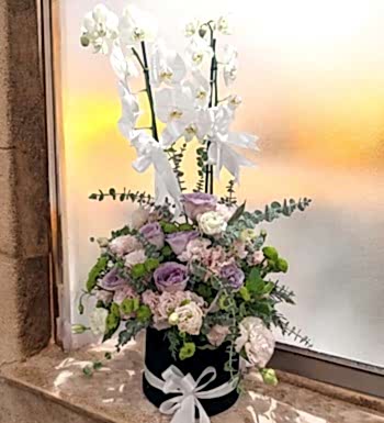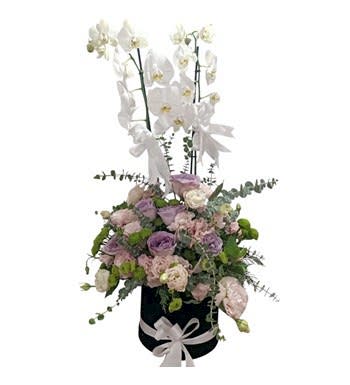 Aurelia Beyaz Orkide Aranjmanı içerisinde lila gül, beyaz gül, beyaz lisyantus ve çift dal beyaz orkide mevcut olup uzman çiçek tasarım ekibimizin sizler için yakınlarınızın özel günlerinde harika bir hediye fırsatı sunmaktadır.