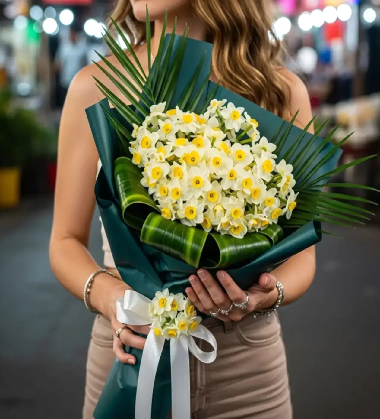 Kontrastın Şıklığı: Nergislerin narin beyazlığını vurgulamak için, koyu zümrüt yeşili (petrol yeşili) ithal kağıt ve dekoratif palmiye yaprakları kullanılmıştır.