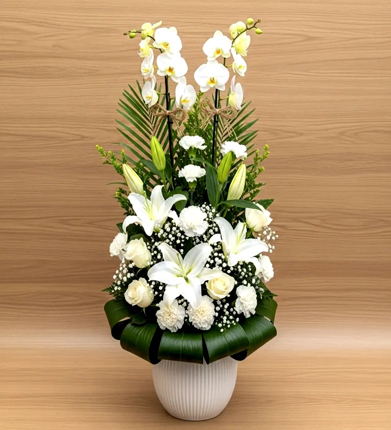 Yüksek formda hazırlanan bu tasarımda; iki dallı beyaz Phalaenopsis orkide, beyaz lilyumlar, güller, karanfiller, baby çiçeği ve tropik yeşillikler şık bir kompozisyon içinde bir araya getirilmiştir.