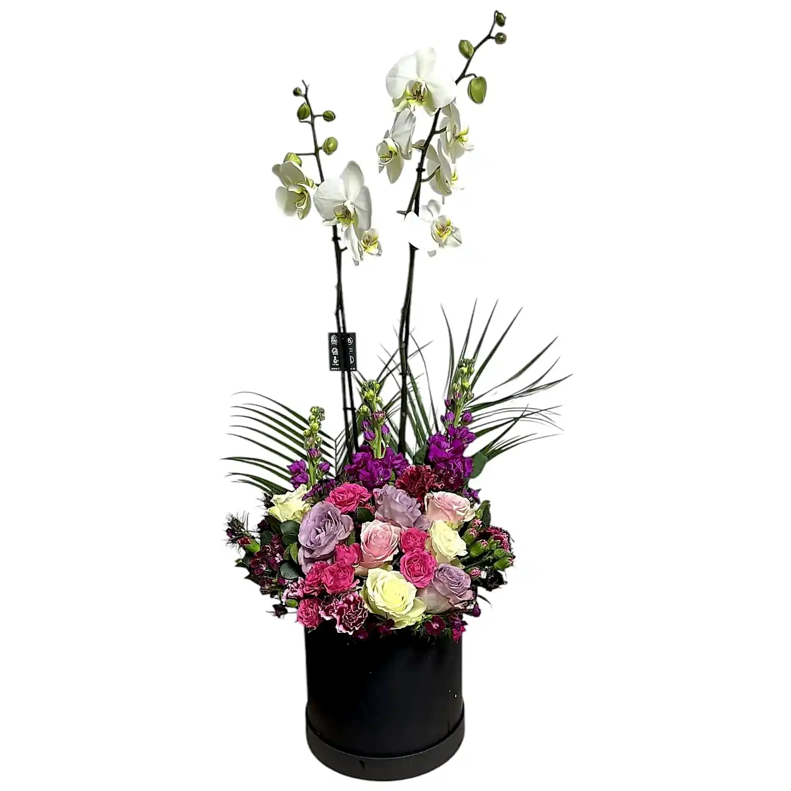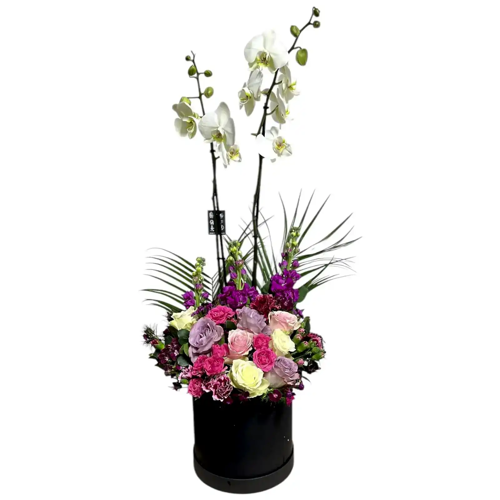 Zarafeti ve göz alıcılığı bir araya getiren Çift Dallı Beyaz Orkide ve Renkli Aranjman, her ortamda dikkatleri üzerine çekecek özel bir tasarıma sahiptir. Bu eşsiz aranjman, beyaz orkidenin doğal zarafetiyle pastel tonlarda güllerin ve canlı renkli çiçeklerin enerjisini birleştiriyor. Şık siyah saksısı ile modern bir görünüm sunarken, ev dekorasyonundan ofis ortamlarına kadar her alanda zarif bir atmosfer yaratır.