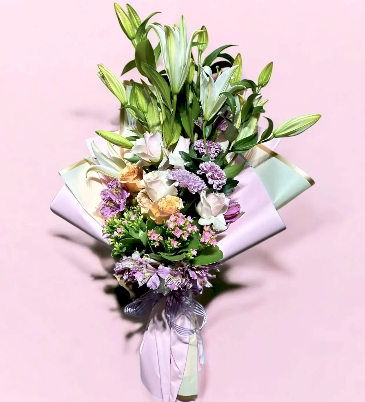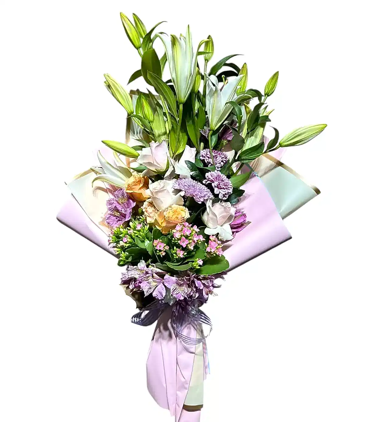 Purple Spring buketi; doğanın uyanışını, romantizmi ve zarafeti bir araya getiriyor. Açık pembe ve mor tonlu güller, beyaz lilyumlar, lavanta renkli papatyalar ve mevsim çiçeklerinin taze dokunuşlarıyla hazırlanan bu özel buket, bahar mevsiminin renkli ruhunu yansıtıyor.