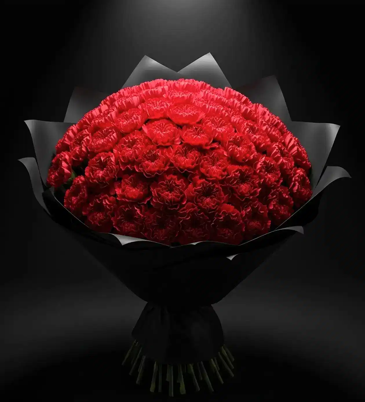 Çarpıcı Görünüm: Kırmızı güllerin klasik yapısından sıkılanlar için, karanfillerin o fırfırlı ve dokulu yapısı siyah paket içinde adeta bir sanat eseri gibi durur.