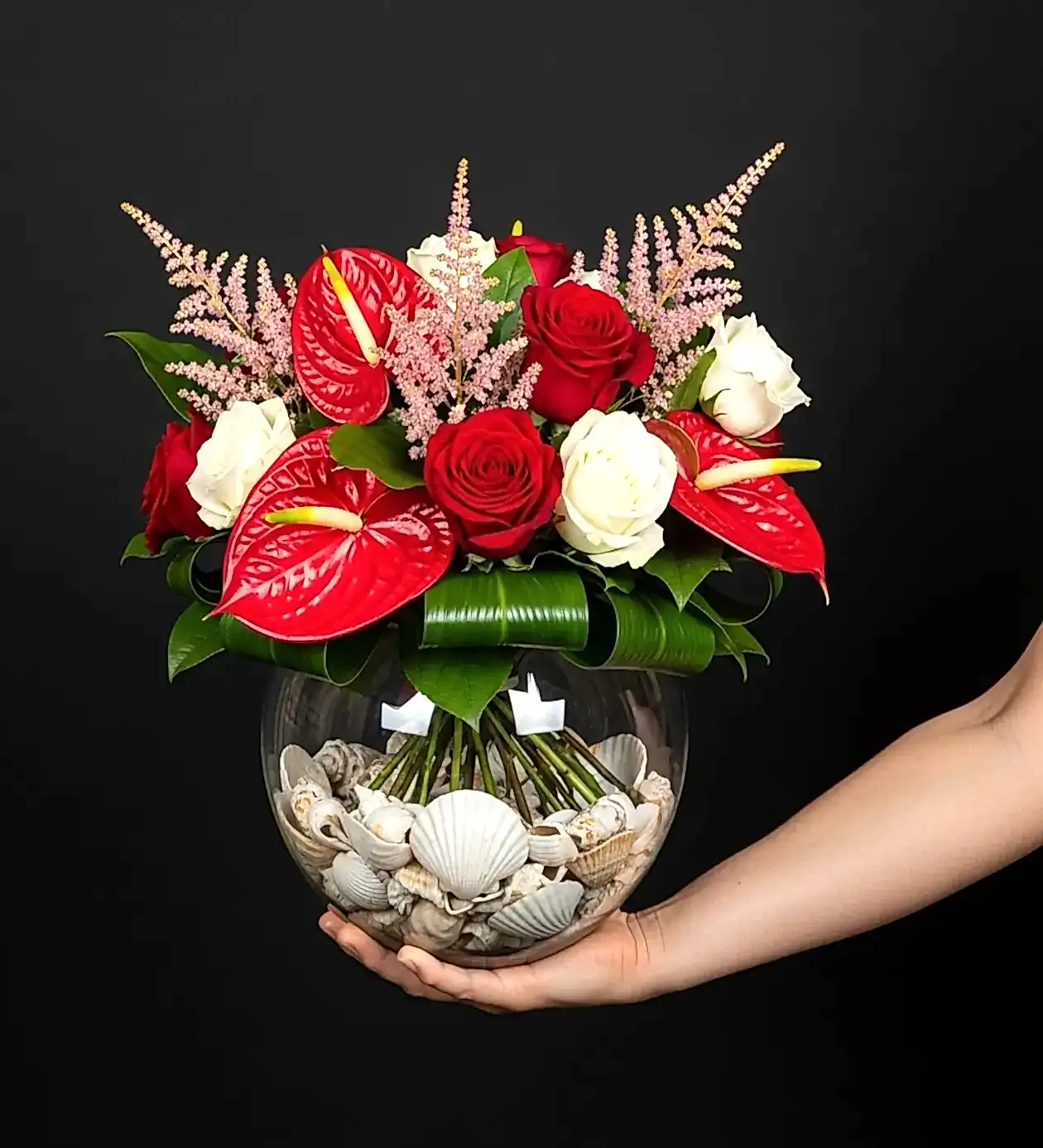 Kırmızı antoryumlar, zarif beyaz ve kırmızı güllerle buluşuyor; pembe astilbe çiçekleriyle zenginleştiriliyor. Tüm bu canlı çiçekler, geniş cam fanus içerisinde estetik bir şekilde düzenlenmiş ve fanusun tabanı, gerçek deniz kabukları ile doldurularak sıra dışı bir görünüm kazandırılmıştır.