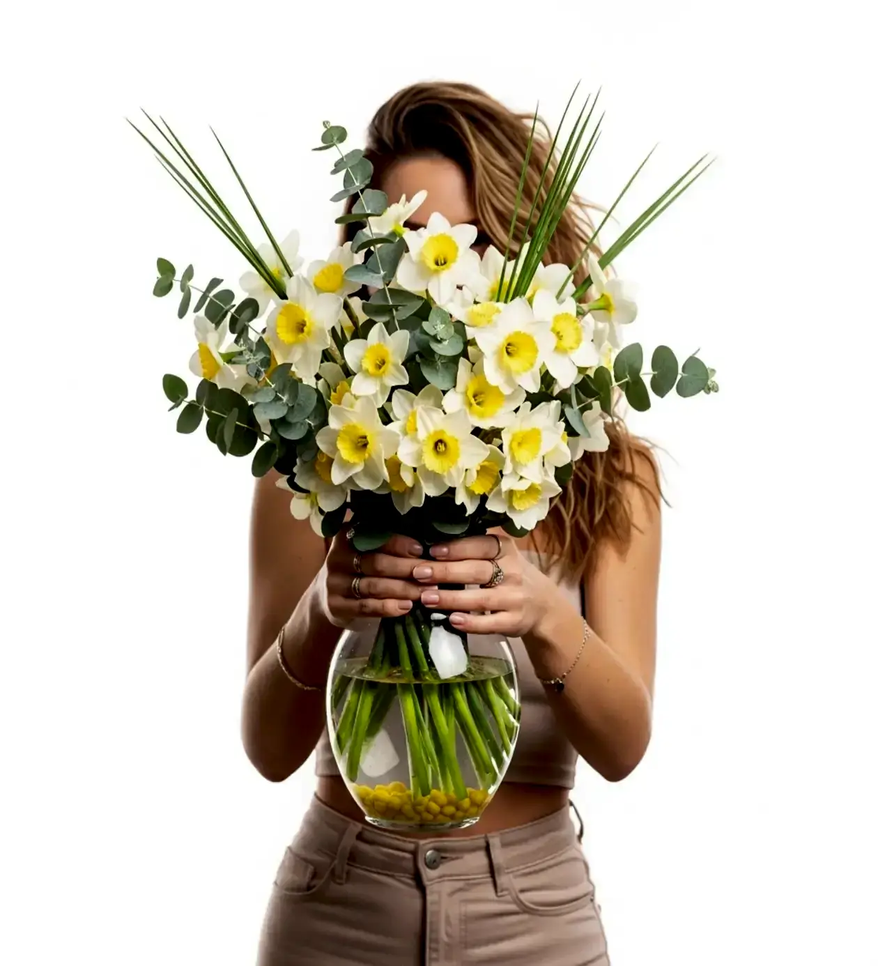 Evinize taze bir bahar sabahının girmesi gibi... Pure Spring Elegance, beyaz nergislerin o narin ve temiz duruşunu, modern bir sunumla birleştiriyor. Beyaz yaprakların ortasındaki güneş sarısı detaylar, vazonun tabanındaki sarı dekoratif taşlarla kusursuz bir uyum yakalayarak, bulunduğu ortama hem huzur hem de estetik katıyor.