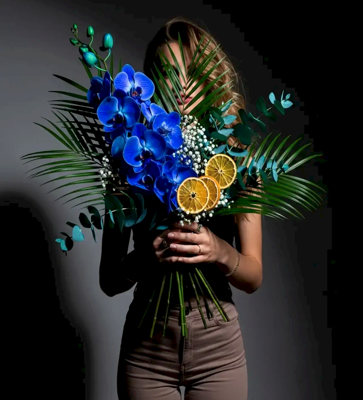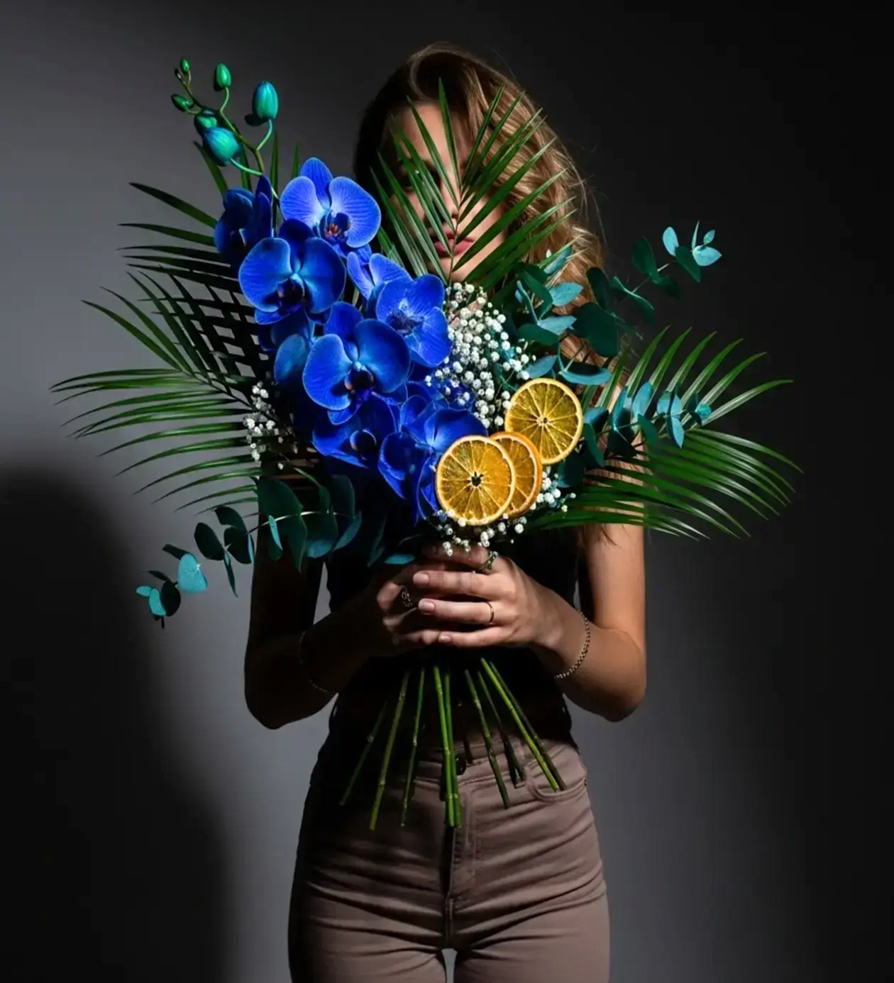 Bu buket sadece görsel bir şölen değil, aynı zamanda dokusal bir deneyim sunuyor. Mavi orkidelerin pürüzsüz dokusu, kurutulmuş portakal dilimlerinin doğal görünümü ve beyaz cipso çiçeklerinin narinliğiyle kusursuz bir tezat oluşturuyor.
