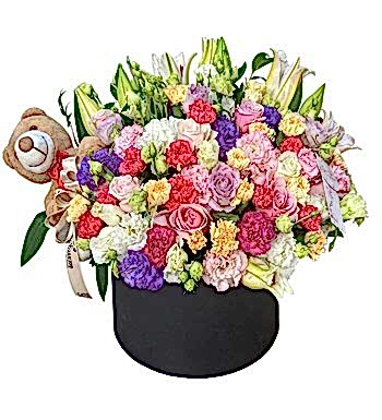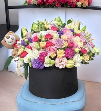 Dev Silindir Kutuda Renkli Çiçekler içerisinde renkli güller, renkli karanfiller, renkli lisyantuslar, lilyum ve teddy bear ayıcık mevcut olup uzman çiçek tasarım ekibimizin sizler için yakınlarınızın özel günlerinde harika bir hediye fırsatı sunmaktadır.