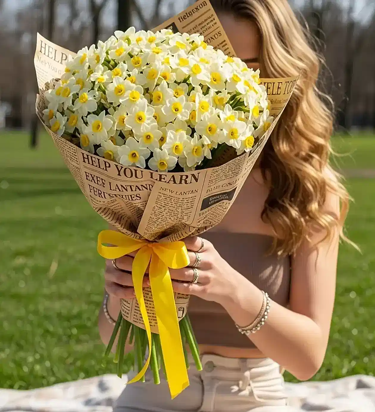 Tasarım Detayları Bu özel tasarımda, mevsimin en sevilen çiçeği Kokulu Sarı Nergisler, sıkı ve dolgun bir buket formunda hazırlandı. Nergislerin doğal güzelliğini ön plana çıkarmak için, üzerinde İngilizce metinlerin yer aldığı retro gazete desenli kraft kağıt kullanıldı. Buketin sap kısmı, nergislerle aynı tonu taşıyan canlı sarı bir kurdele ile bağlanarak, nostaljiye modern ve enerjik bir dokunuş eklendi.