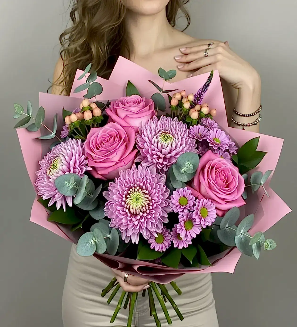 Buket; yumuşak pembe tonlar, okaliptus yapraklarının yeşil dokunuşu ve pastel ambalajla kusursuz bir bütünlük sunar.
