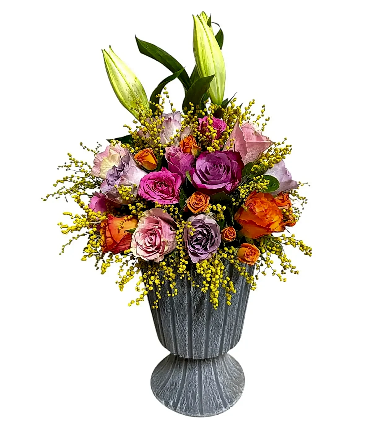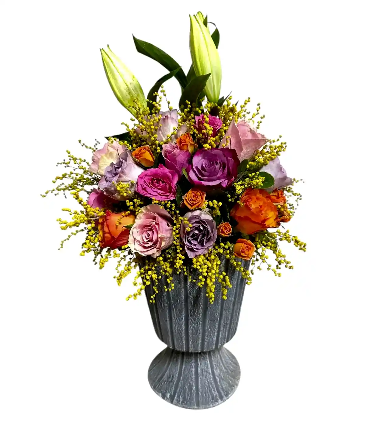 Sevdiklerinize zarif ve göz alıcı bir hediye sunmak ister misiniz? Lüks el yapımı saksı içerisinde özenle hazırlanan bu özel çiçek aranjmanı, pembe, turuncu, lila ve beyaz ithal güller, mis kokulu lilyum çiçekleri ve taptaze mimoza dalları ile harmanlanarak benzersiz bir görünüm sunar. Her detayında kalite ve estetik bulabileceğiniz bu aranjman, özel günlerde sevdiklerinizi mutlu etmek için mükemmel bir seçim!