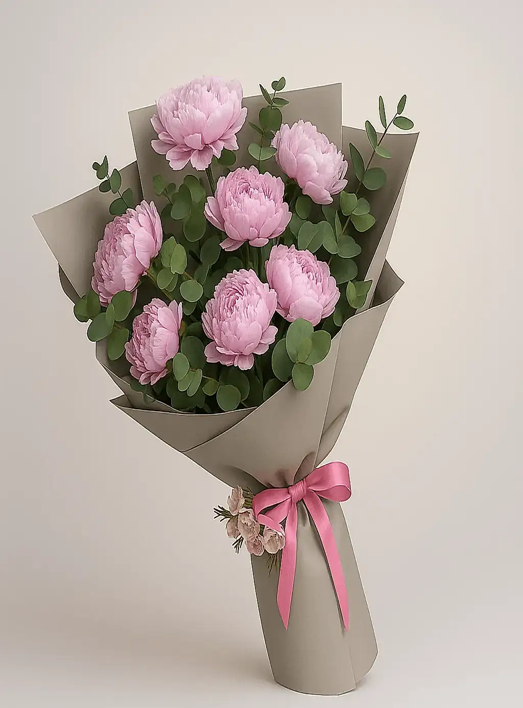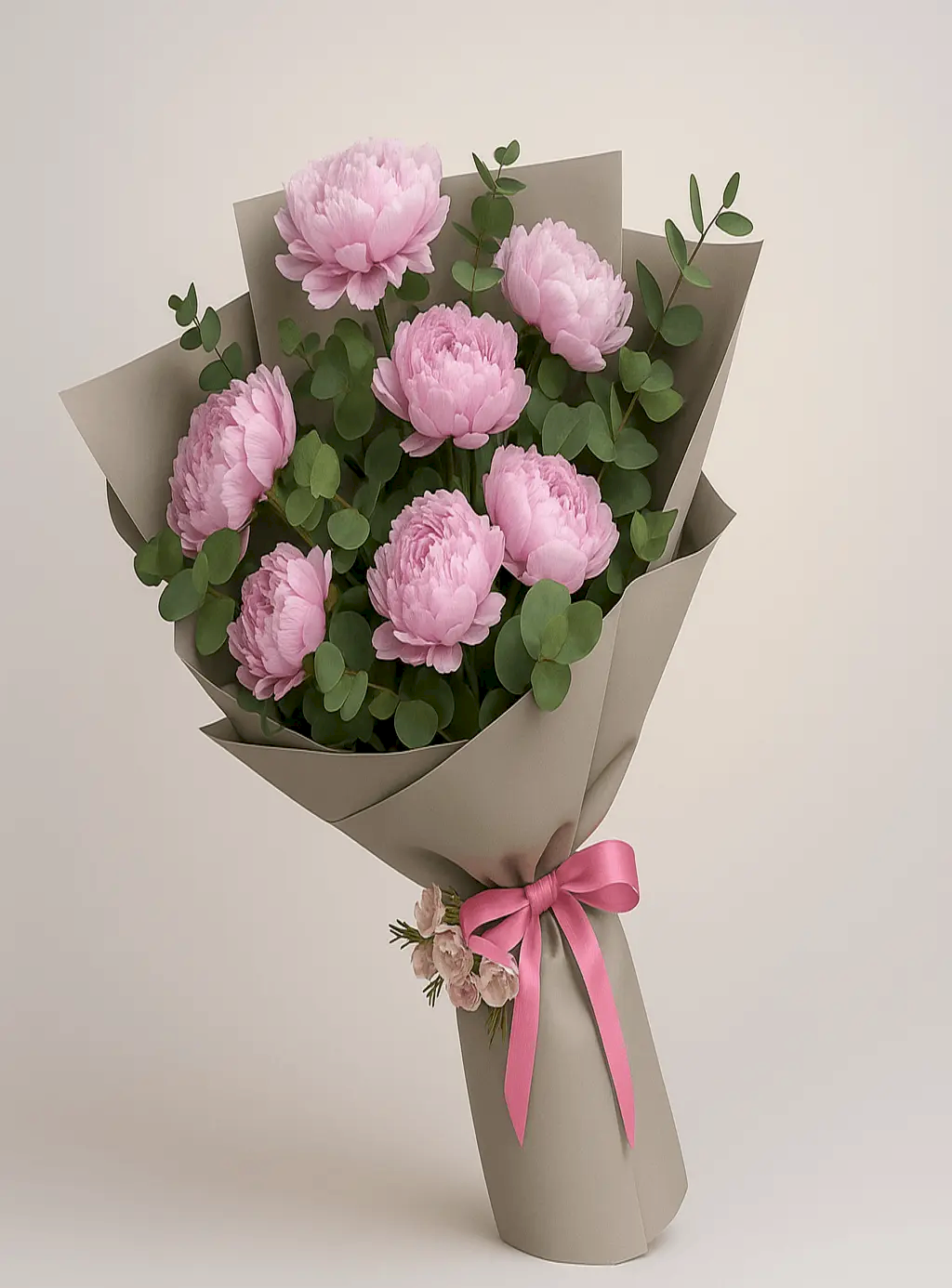 Buketimizin yıldızı: zarafetin ve romantizmin simgesi olan pembe şakayık çiçekleri. Geniş yapraklı yeşillikler ve şık gri sargı ile desteklenen bu özel buket, fuşya saten kurdele ile tamamlanarak sade ama etkileyici bir görünüm sunar.