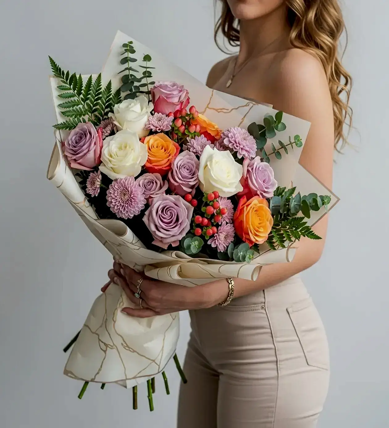 Golden Symphony Bouquet, YouBlossom’un exclusive premium collection serisinin göz alıcı tasarımlarından biridir. Beyaz güllerin saflığı, mor güllerin romantizmi ve turuncu güllerin enerjisi; pastel pembe krizantemler ve egzotik yeşilliklerle buluşarak sofistike bir buket oluşturur.