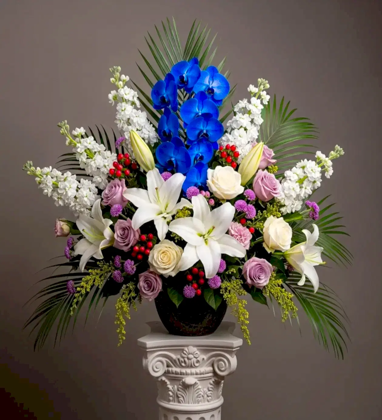 Egzotik Zarafetin ve VIP Hacmin Buluşması Bazı anlar, standartların çok ötesinde, akıllara kazınacak kadar gösterişli bir kutlama gerektirir. Bu devasa aranjmanın kalbinde, nadir bulunan ve mistik bir güzelliğe sahip egzotik mavi Phalaenopsis orkideler dikey bir asaletle yükseliyor. Orkidelerin bu keskin ve çarpıcı rengi, aranjmanın alt katmanını dolduran mis kokulu beyaz lilyumlar, dikey formlu beyaz şebboylar ve yumuşak lila güllerle muazzam bir renk dengesine ulaşıyor.