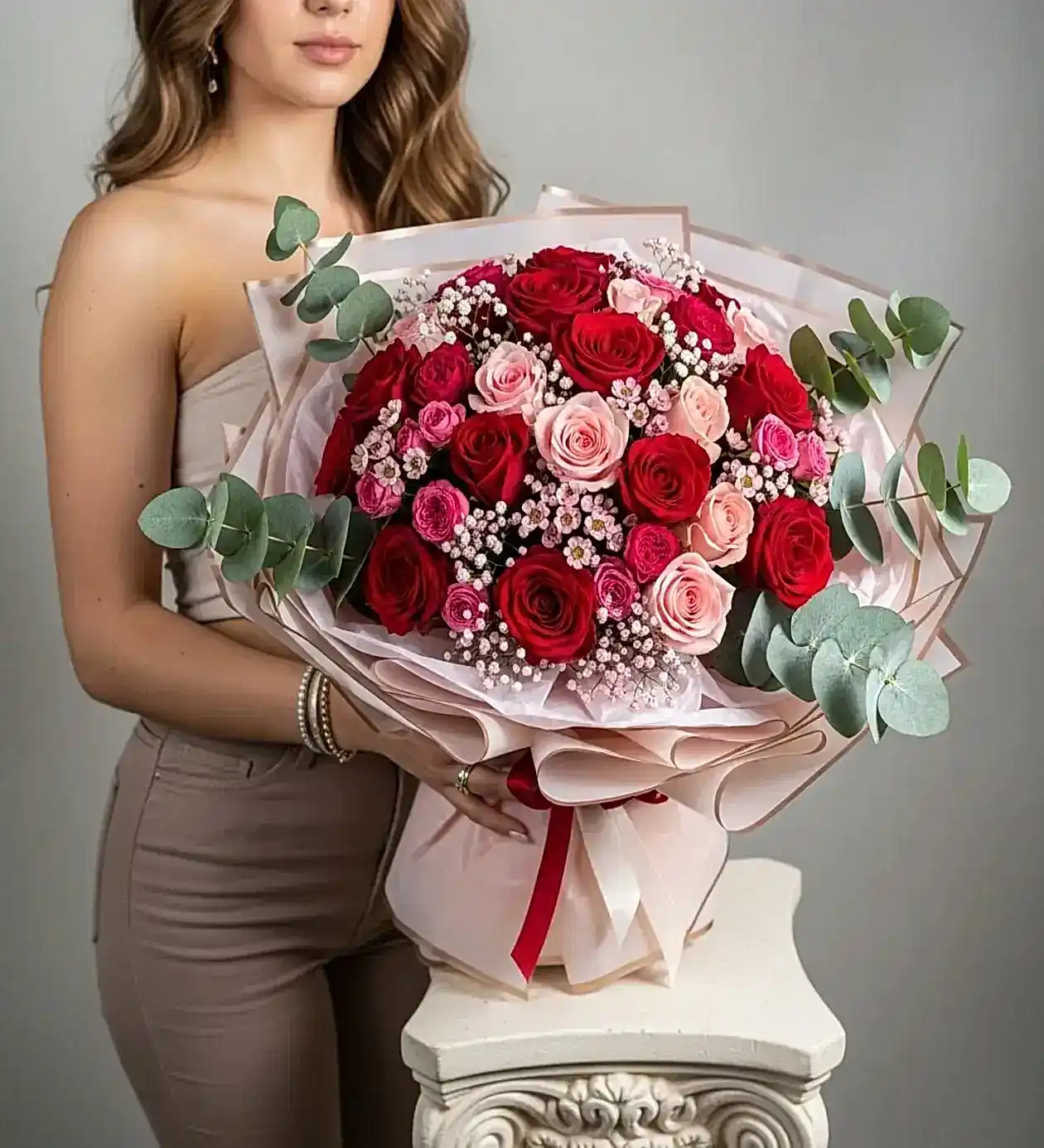 Özenle seçilmiş kırmızı güller, saf sevgiyi temsil eden pembe güllerle harmanlanıyor; aralara eklenen cipso ve okaliptüs dallarıyla modern bir şıklık kazanıyor.