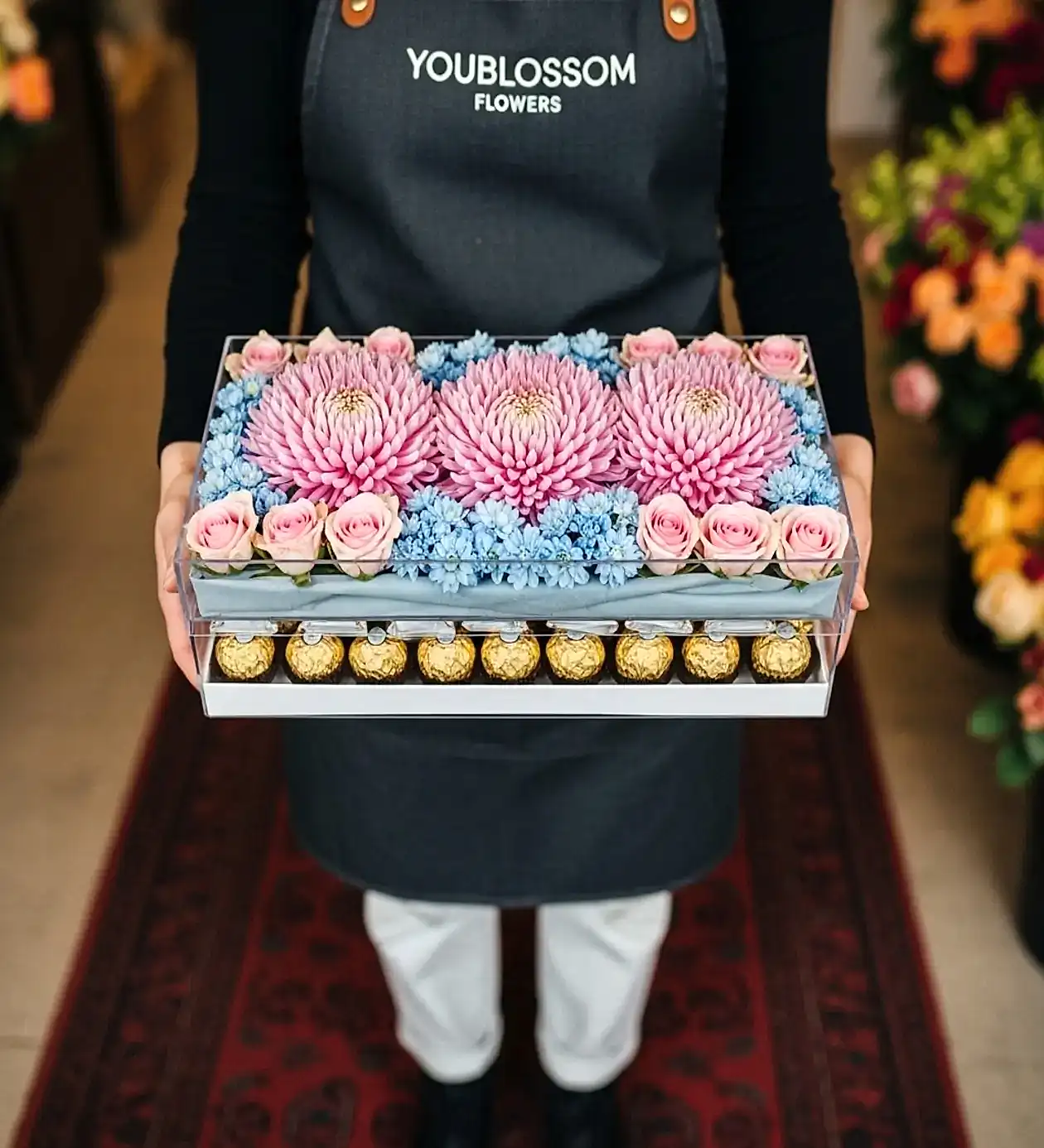 Hayatınızın en özel “evet”’ine doğru atılan ilk adımda, zarafet ve özenle hazırlanmış bu çiçekli çikolata aranjmanıyla etkileyici bir izlenim bırakın. Üst kısmında yer alan üç büyük pembe krizantem, sevginin büyüklüğünü ve samimiyetini simgelerken; çevresini saran pastel pembe güller ve mavi ortancalar sıcaklığı ve inceliği temsil eder. Alt kısımda ise altın ambalajıyla göz kamaştıran 🍫 Ferrero Rocher çikolatalar, bu özel sunumu tatlandırarak lüks bir dokunuş katıyor.