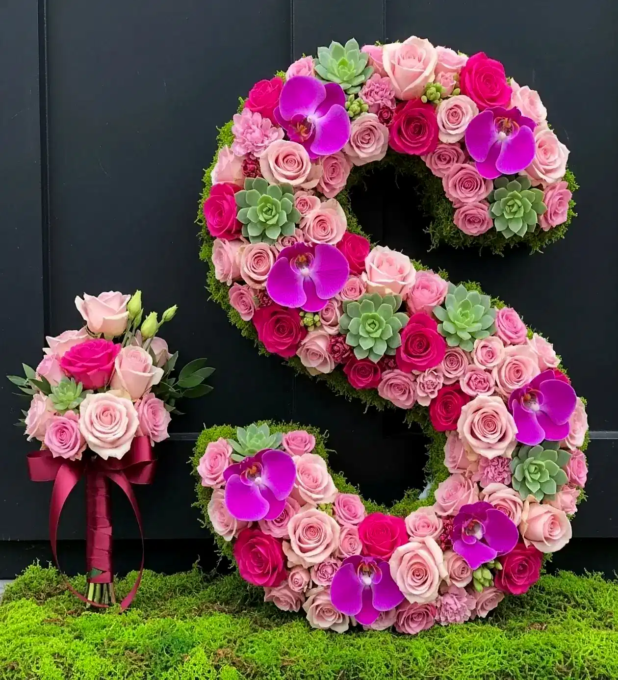 S harfi formunda hazırlanan bu özgün aranjman, lüks çiçeklerin en göz alıcı kombinasyonu ile tasarlandı. Zemininde doğadan ilham alan yosun dokusu yer alırken, yapının tamamı en taze ve kaliteli çiçeklerle işlenmiştir.