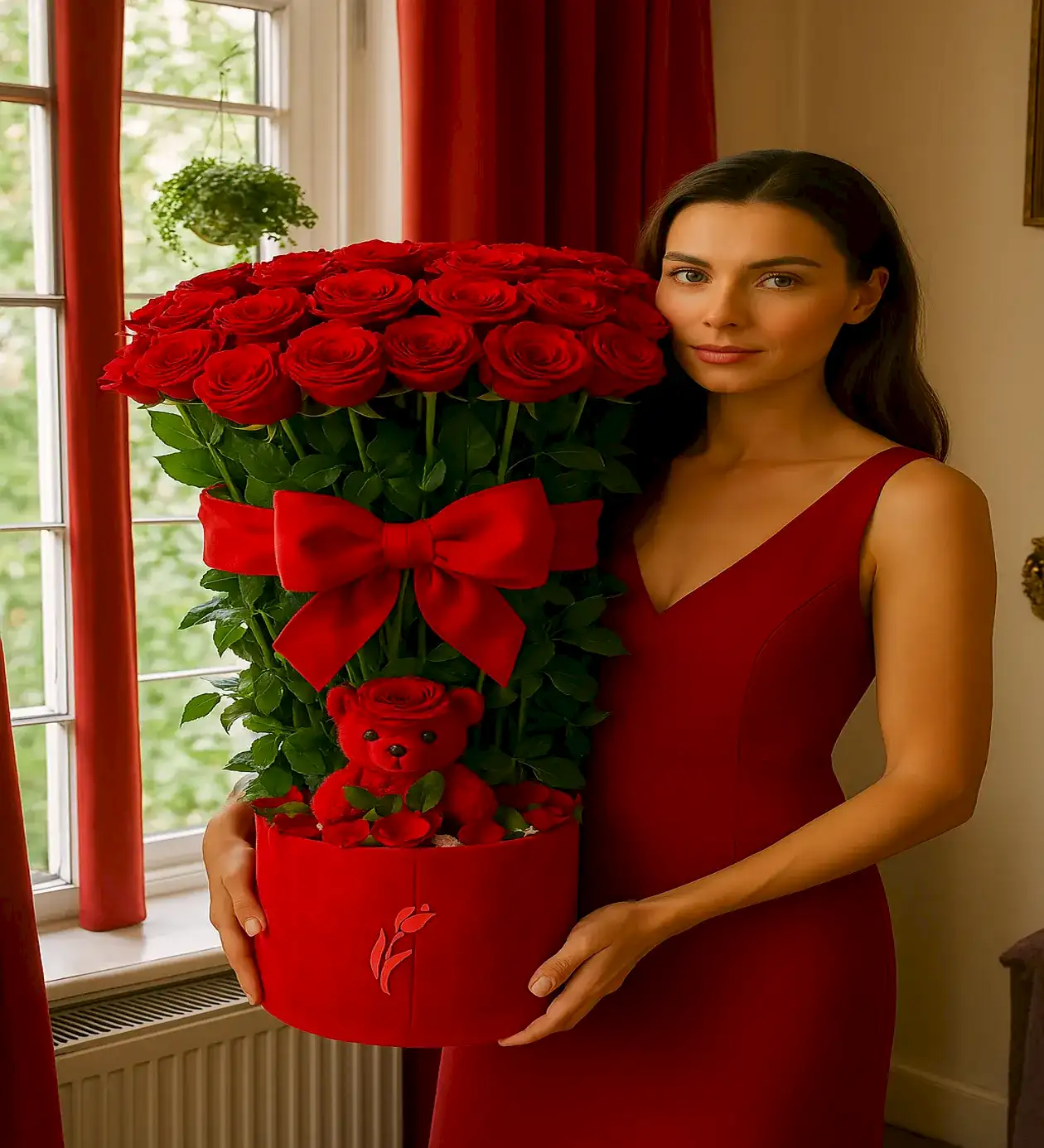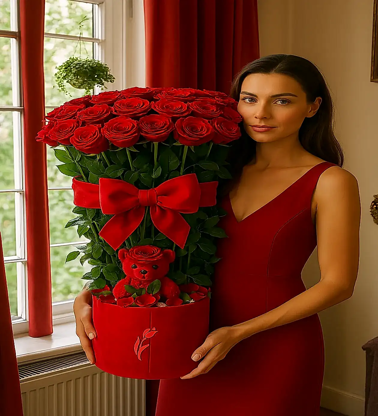 Aşkınızı dile getirmenin en gösterişli, en unutulmaz yolu: Kırmızı kadife kutuda, büyük boy kurdeleyle süslenmiş dev kırmızı gül aranjmanı! Her biri özenle seçilen taptaze kırmızı güller, kutunun içindeki sevimli kırmızı peluş ayıcıkla tamamlanarak aşk dolu bir atmosfer yaratır.