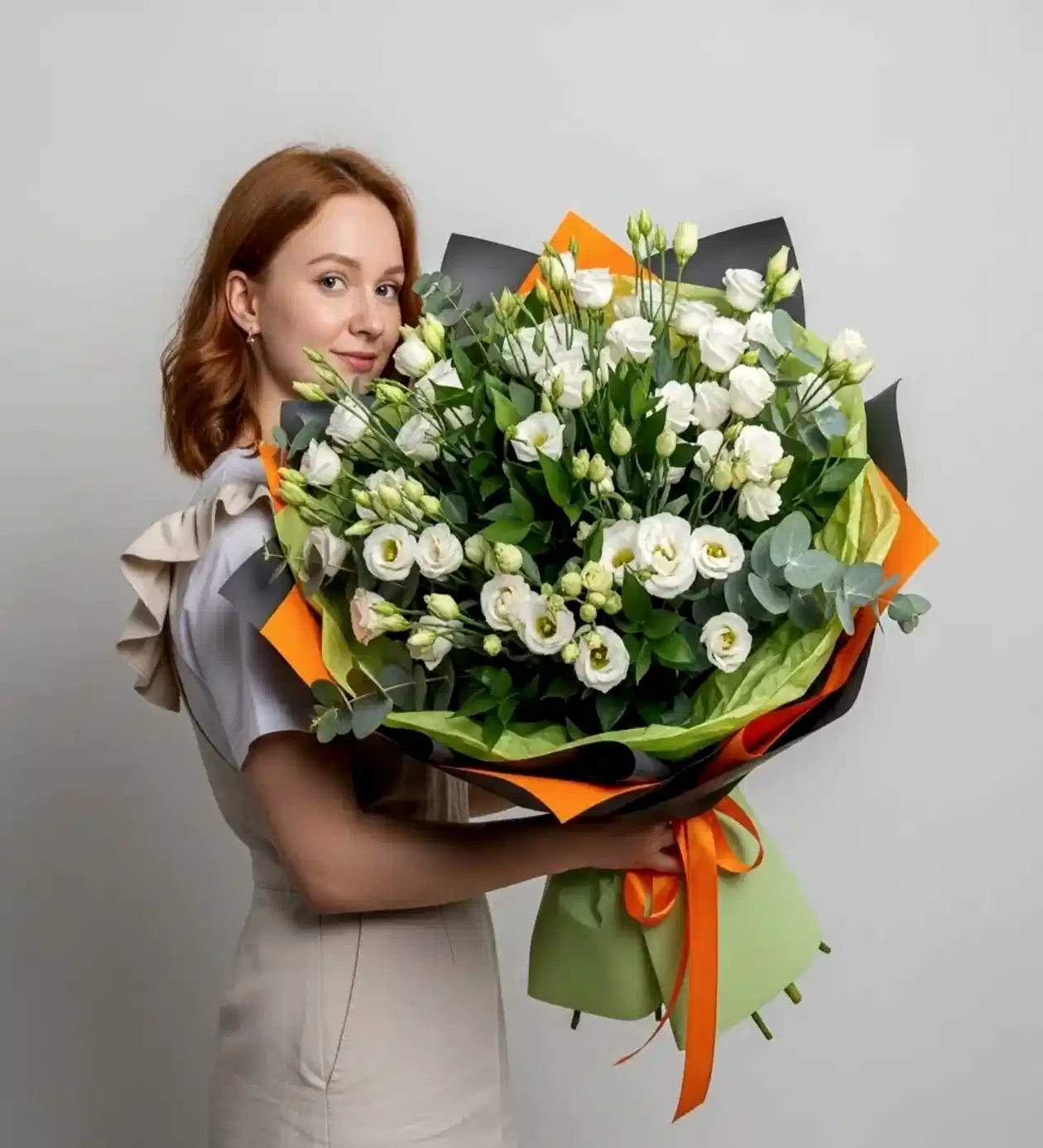 “Beyaz Düş” buketi; masumiyetin, zarafetin ve sadeliğin sembolü olan beyaz lisyantus çiçekleriyle hazırlanmış göz alıcı bir aranjmandır. İnce yapraklı, yumuşak dokulu lisyantuslara, modern tasarımı tamamlayan eucalyptus dalları ve iri yeşil yapraklar eşlik eder. Turuncu, siyah ve yeşil tonlardaki lüks kraft ambalajı, buketin modern görünümünü vurgular.