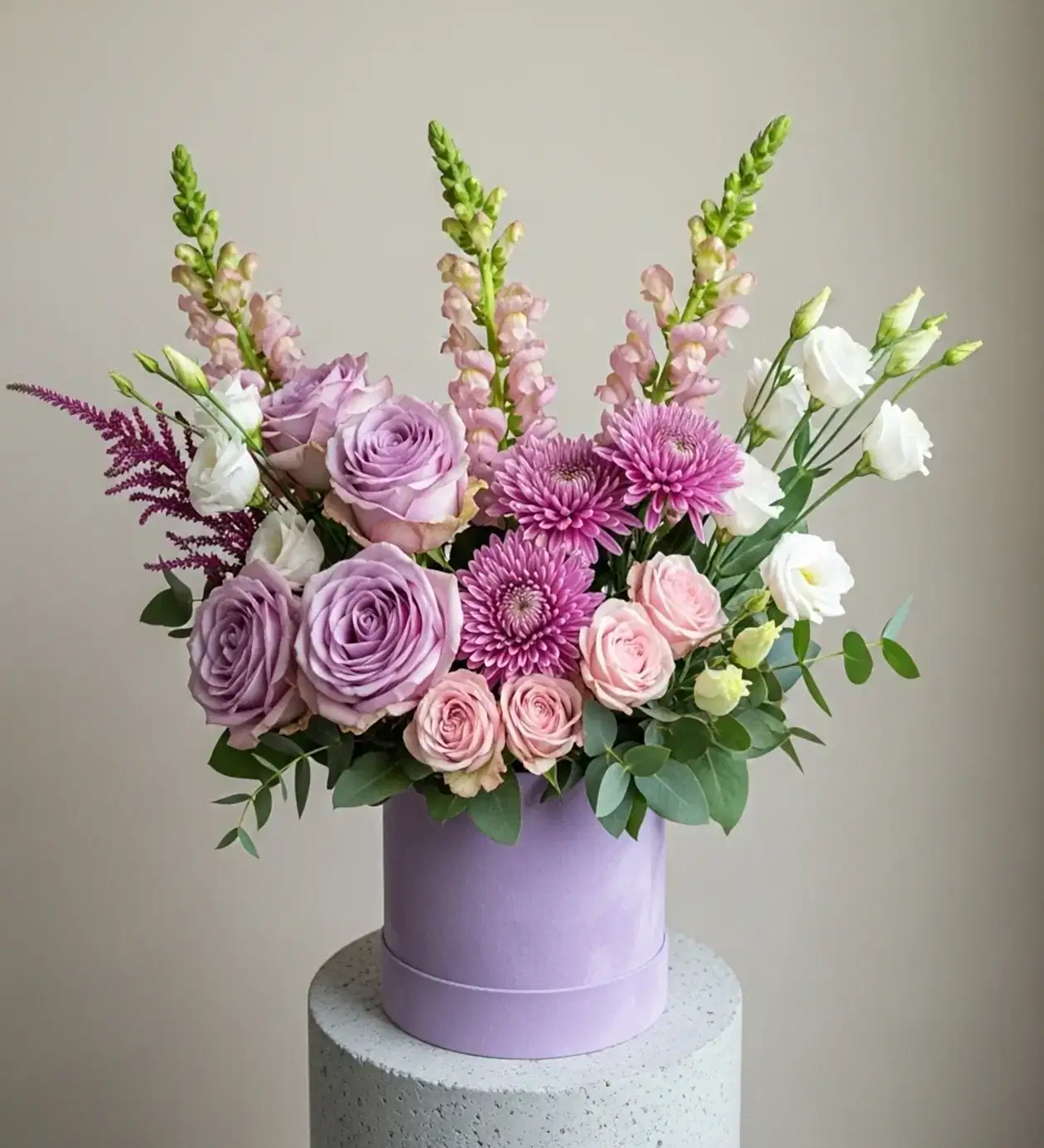 💐 Lavanta Bahçesi, pastel tonların zarif uyumuyla göz kamaştıran bir kutu aranjmandır. Özenle seçilmiş 5 adet lila gül, 5 adet somon pembe gül, 3 adet beyaz lisyantus, 3 adet lavanta tonlarında krizantem, 2 adet şebboy, okaliptus ve dekoratif yeşillikler ile tamamlanmıştır.