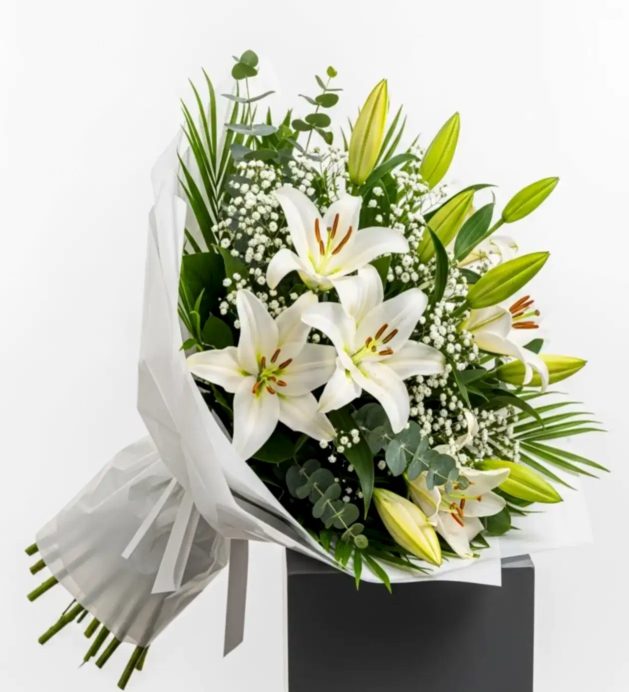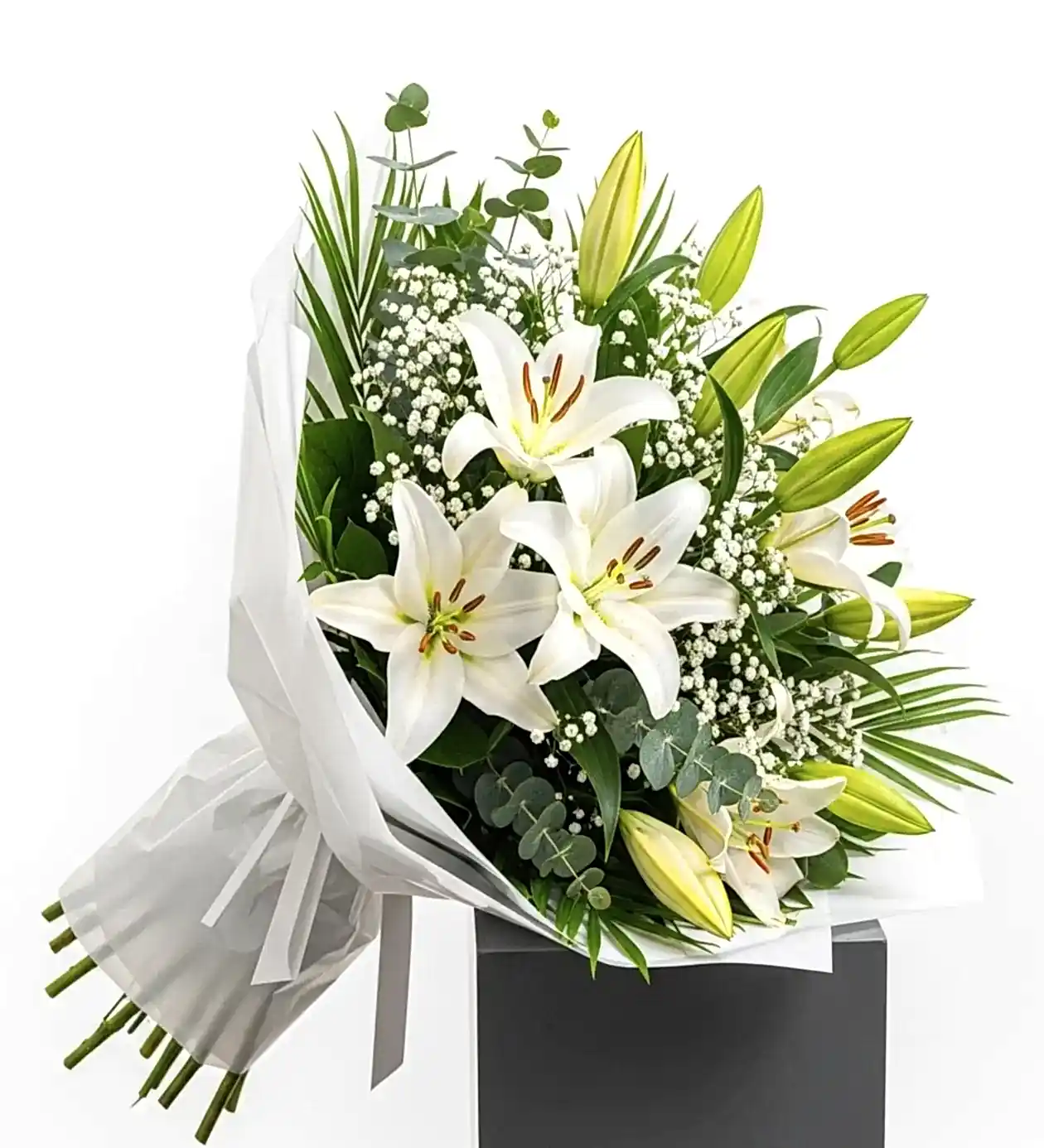 Saflığın ve zarafetin sembolü olan beyaz lilyum buketi, en özel anlarınıza anlam katmak için hazırlandı. Açan ve tomurcuk haldeki lilyum çiçekleri, cipsofilya ve doğal yeşillikler ile tamamlanarak sade ama etkileyici bir görünüm kazandı.