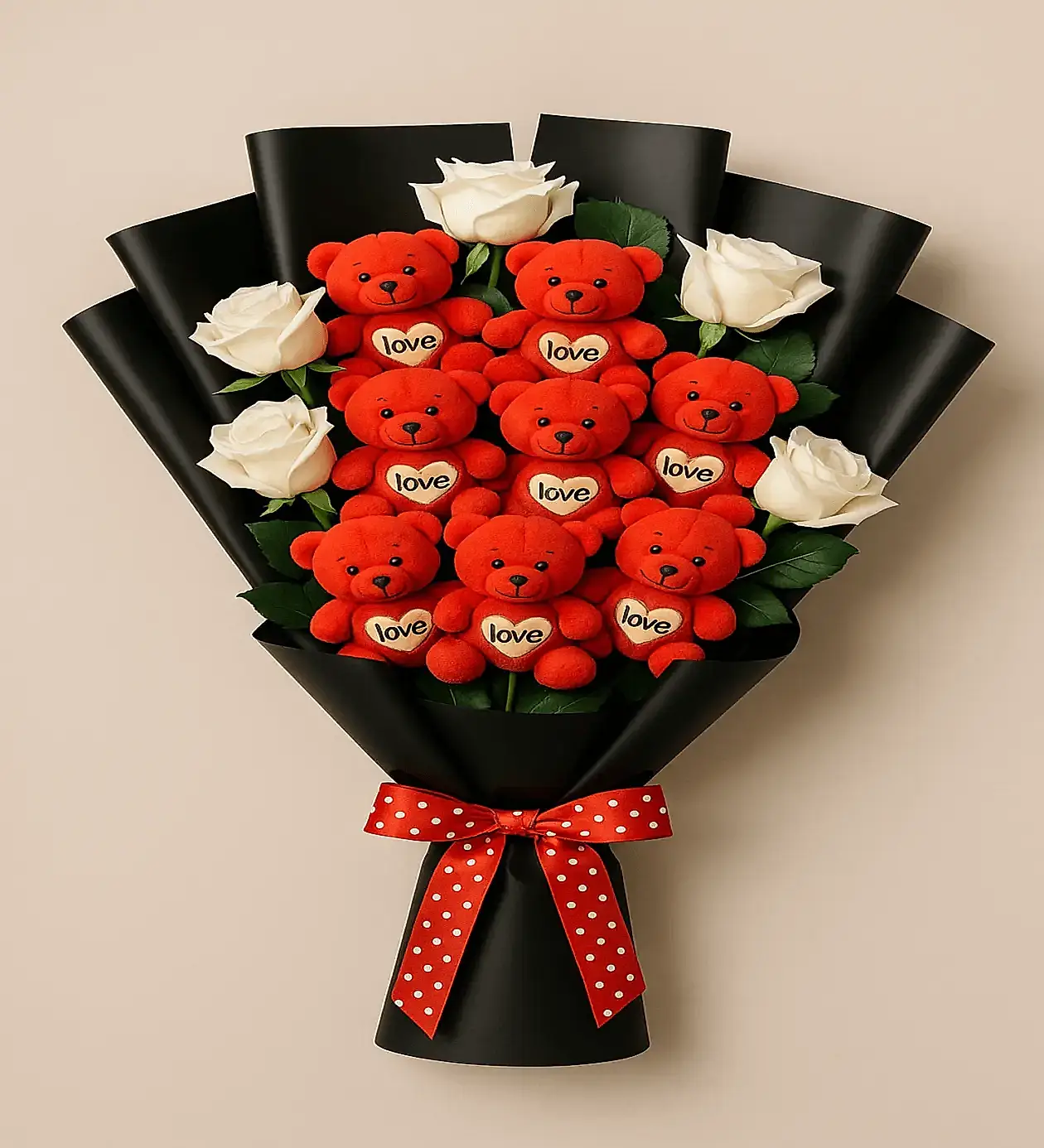 Siyah zarif sargı içinde 9 adet peluş love temalı kırmızı ayıcık ve aralarına serpiştirilmiş 6 adet taze beyaz gül ile hazırlanan bu özel buket, sevginizi eğlenceli ve etkileyici bir şekilde ifade etmenize yardımcı olur.