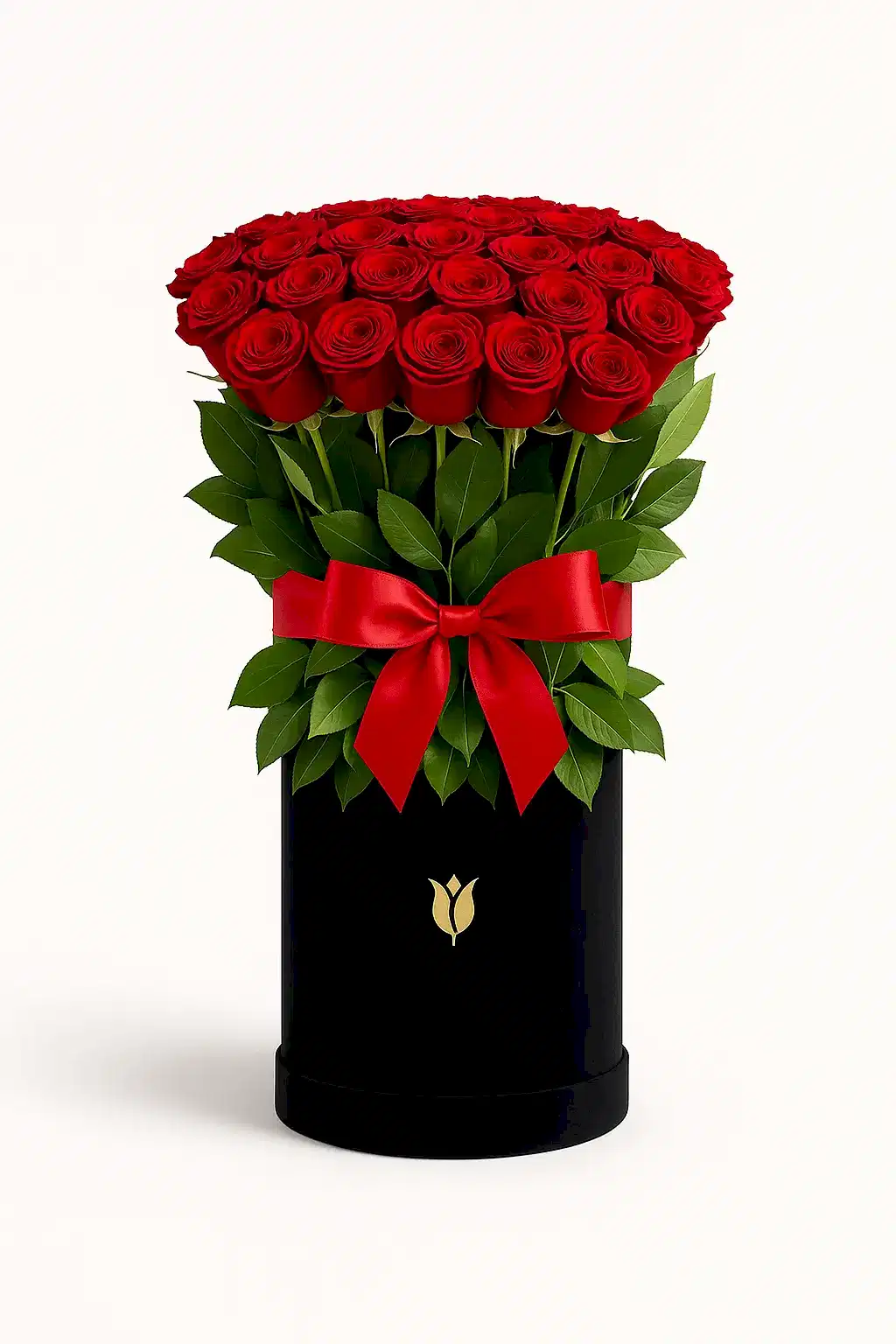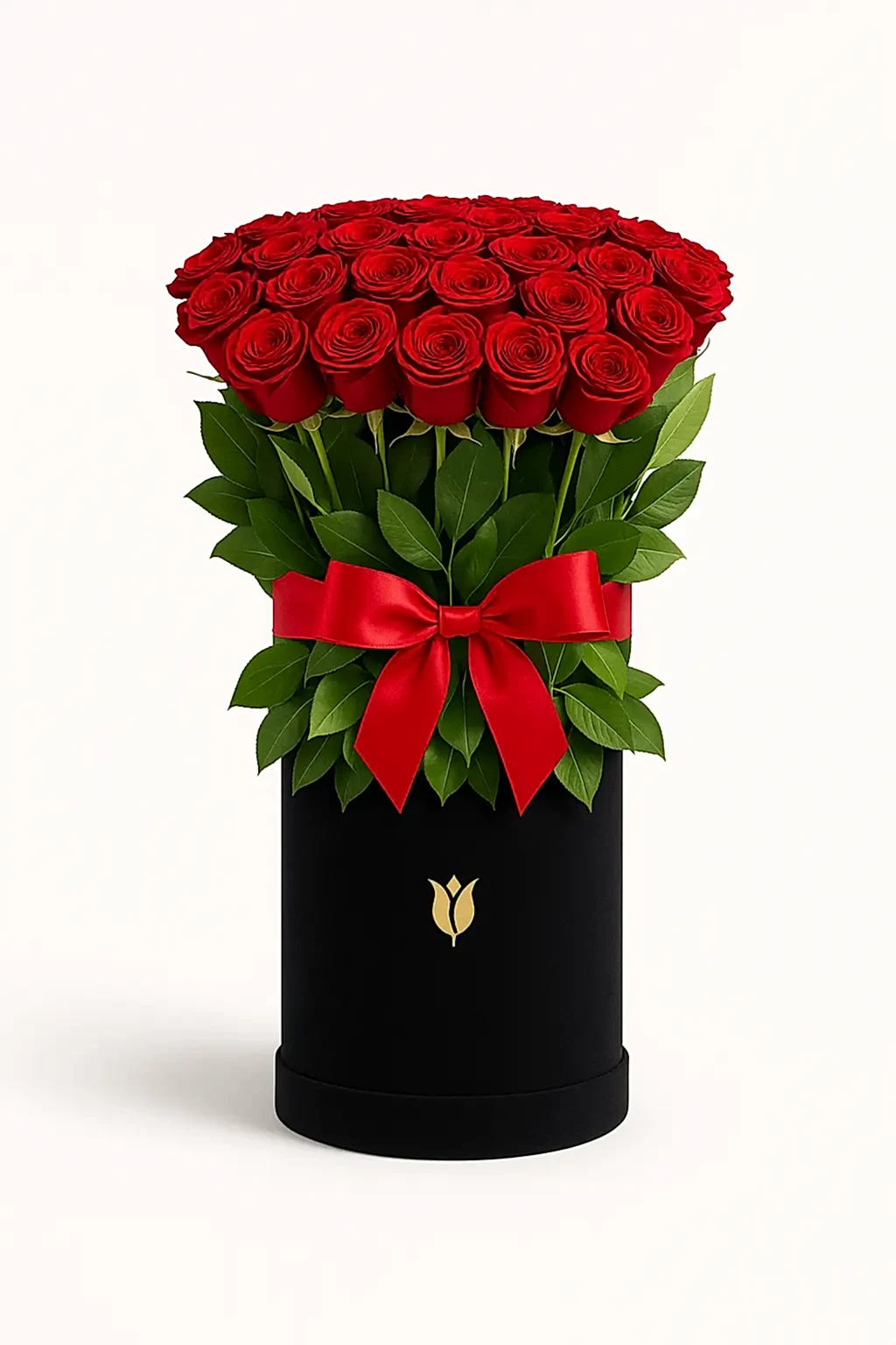 Görkemli siyah silindir kutuda yer alan 50 adet taptaze kırmızı gül, göz alıcı yeşil yapraklar ve şık kırmızı saten kurdele ile bir araya gelerek zarafetin ve romantizmin simgesi haline geliyor.