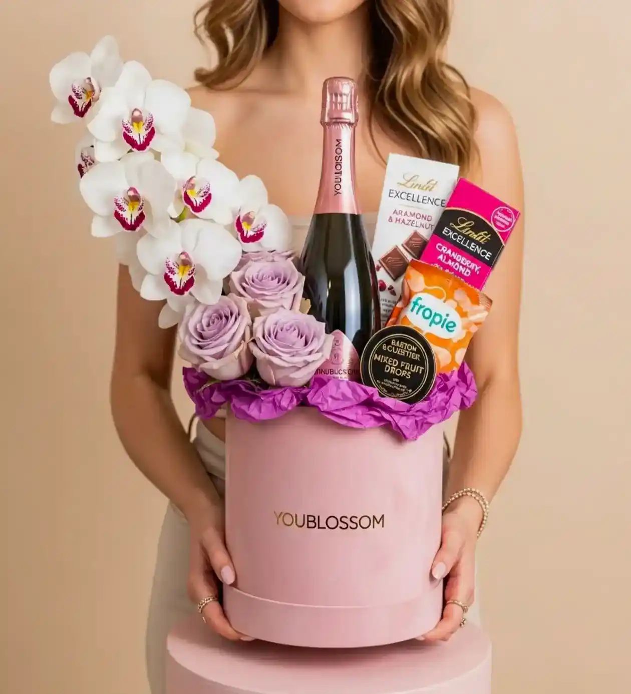 Orchid Luxe Celebration – Alkolsüz Şampanya & Gurme Çiçek Hediye Kutusu, YouBlossom’un exclusive luxury collection serisinin en özel parçalarından biridir. Saf beyaz orkidelerin zarafeti, lavanta güllerin romantizmi ve alkolsüz pembe şampanyanın kutlama enerjisi, Lindt çikolatalar ve gurme atıştırmalıklarla birleşerek unutulmaz bir hediye deneyimi sunar.