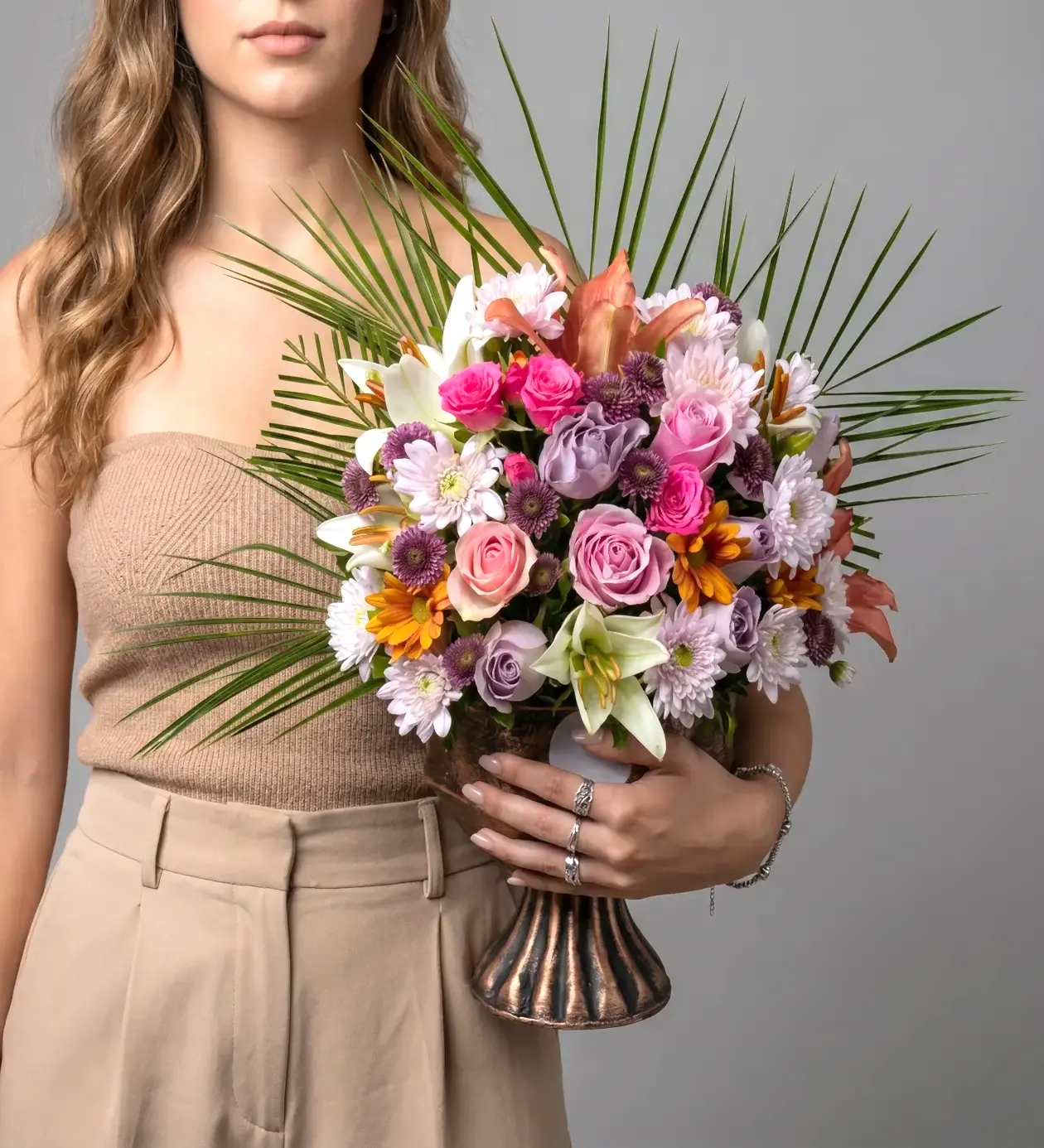 Asil Dokunuşlar: Mis kokulu beyaz lilyumlar ve hacimli krizantemler, renk cümbüşünü asaletle dengeler. Egzotik palmiye yaprakları ise tasarıma geniş, kucaklayıcı ve heykelsi bir form kazandırır.