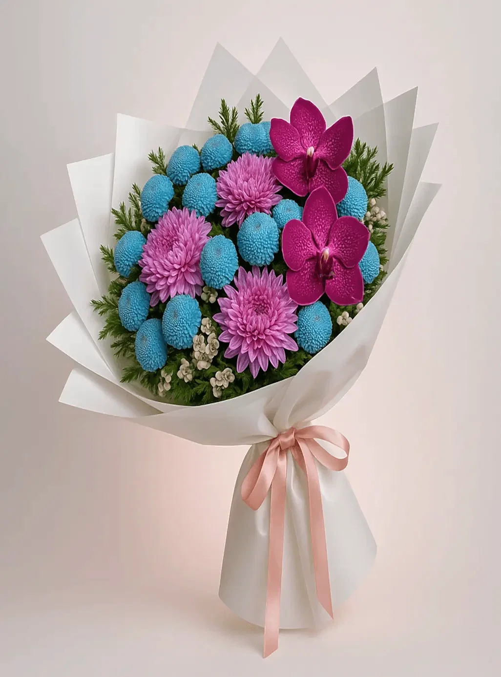 “Melinda Anastasia” çiçeği buketi, canlı tonları ve zarif formuyla fark yaratmak isteyenlerin tercihi. Egzotik mor orkide, nadir görülen mavi krizantemler ve pembe aster çiçekleriyle oluşturulan bu tasarım, sade beyaz ambalaj ve pembe kurdeleyle tamamlanır.