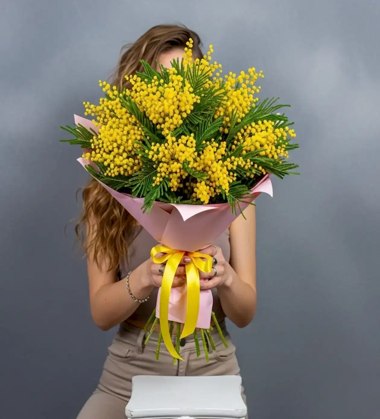 Karışık buketlerden ziyade saf güzelliği tercih edenler için hazırlanan bu tasarım, kucak dolusu pofuduk sarı mimozalardan oluşuyor. Tasarımın enerjisini zirveye taşıyan detay ise ambalajında gizli: Mimozanın canlı sarısını mükemmel bir şekilde dengeleyen soft pembe kağıt ve buketin belini saran parlak sarı kurdele, buketin feminen ve neşeli ruhunu ön plana çıkarıyor. Odaya girdiği an etrafa yayılan benzersiz mimoza kokusu ise bu görsel şöleni tamamlıyor.
