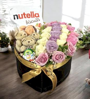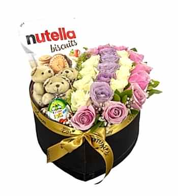 Mix Rose İn Heart Box içerisinde lila gül, pembe gül, beyaz gül ve somon gül, teddy ayıcık ve surpiz yumurta, nutella biscuits mevcut olup uzman çiçek tasarım ekibimizin sizler için yakınlarınızın özel günlerinde harika bir hediye fırsatı sunmaktadır.