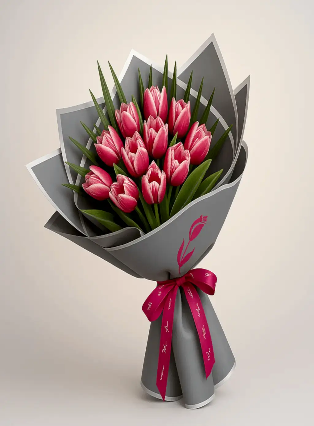 Doğallığın ve şıklığın simgesi olan pembe laleler, füme gri sargı ve fuşya kurdele ile zarif bir şekilde sunuluyor. Baharın habercisi olarak bilinen lale çiçekleri; saflığı, sevgiyi ve yeniden doğuşu simgeler.