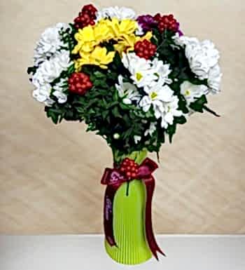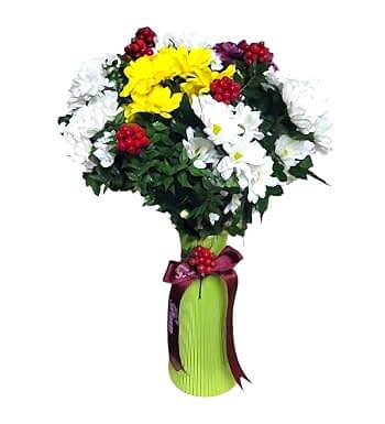 Profesyonel floristlerimiz tarafından hazırlanan yeni yıl çiçeği, beyaz papatyaların zarafeti ile kırmızı kokinaların canlılığını muhteşem bir uyumla birleştiriyor. Özel tasarım yeşil cam vazo ve şık bordo kurdele ile tamamlanan aranjmanımız, yılbaşı hediyesi olarak mükemmel bir seçim.