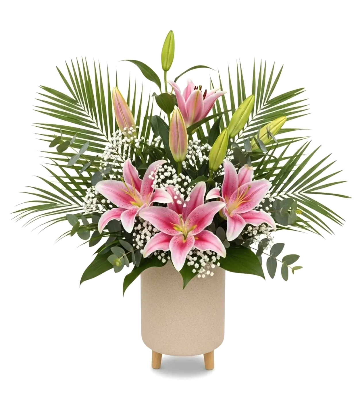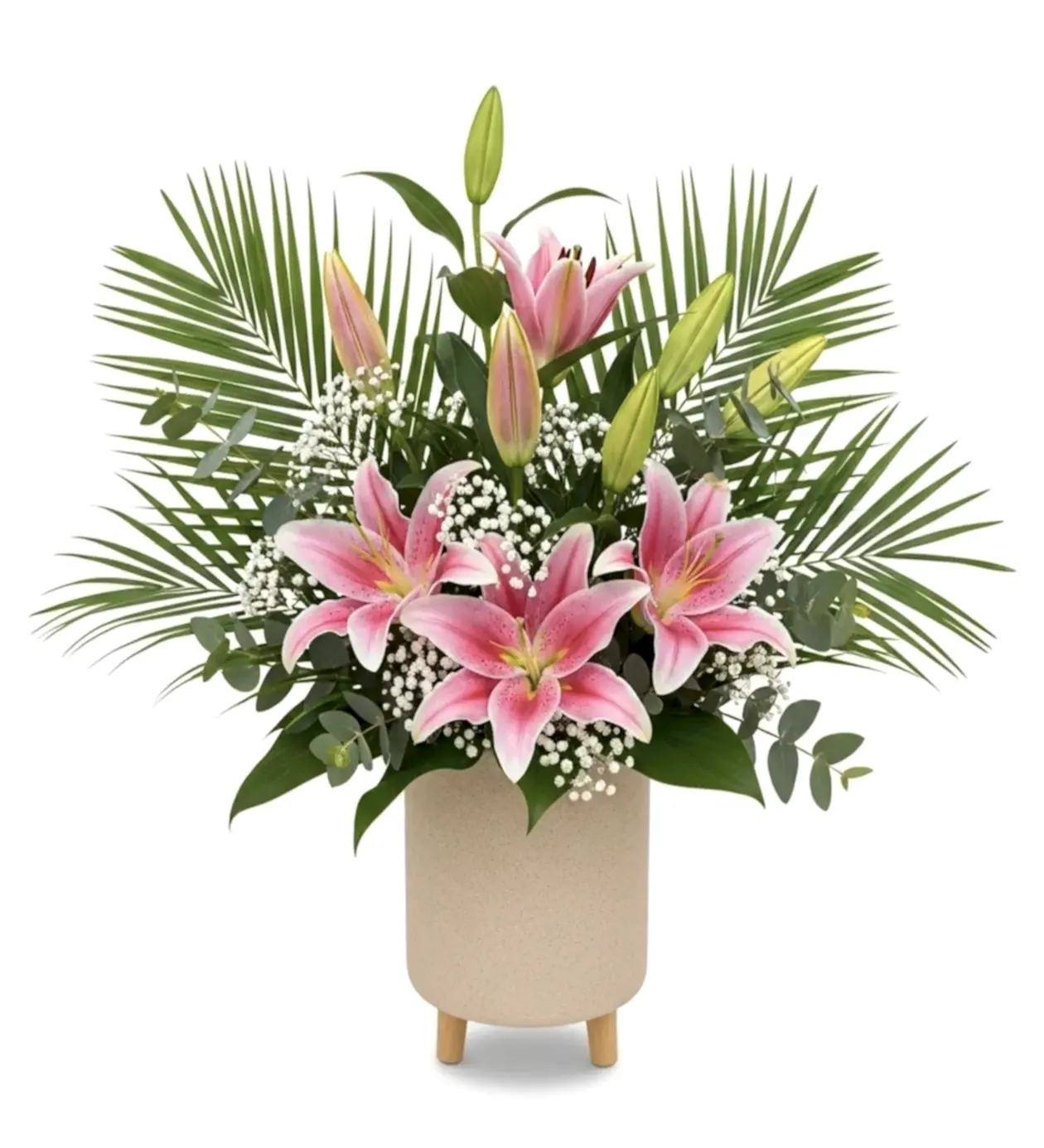 Canlılığın ve doğallığın iç mekanlara zarif bir dokunuşu: Doğal Ferahlık Aranjmanı, büyüleyici görünümüyle öne çıkan pembe lilyum çiçekleri, zarif cipso çiçekleri ve hacimli palmiye yaprakları ile özenle tasarlandı. Aranjmanda hem açmış hem de açmaya hazır tomurcuklar yer alarak uzun süreli bir çiçeklenme sunar.