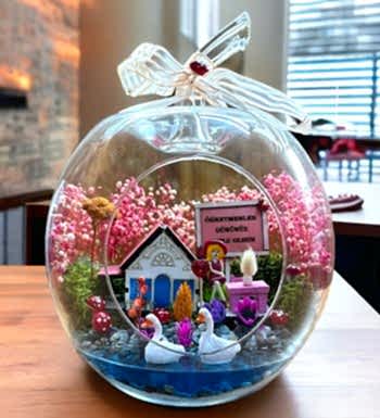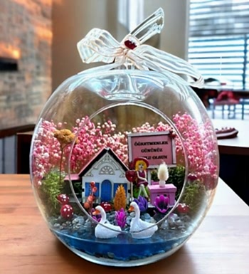 Öğretmenler Günü Hediyesi Teraryum içerisinde öğretmenler gününe özel biblolar mevcut olup uzman çiçek tasarım ekibimizin sizler için yakınlarınızın özel günlerinde harika bir hediye fırsatı sunmaktadır.