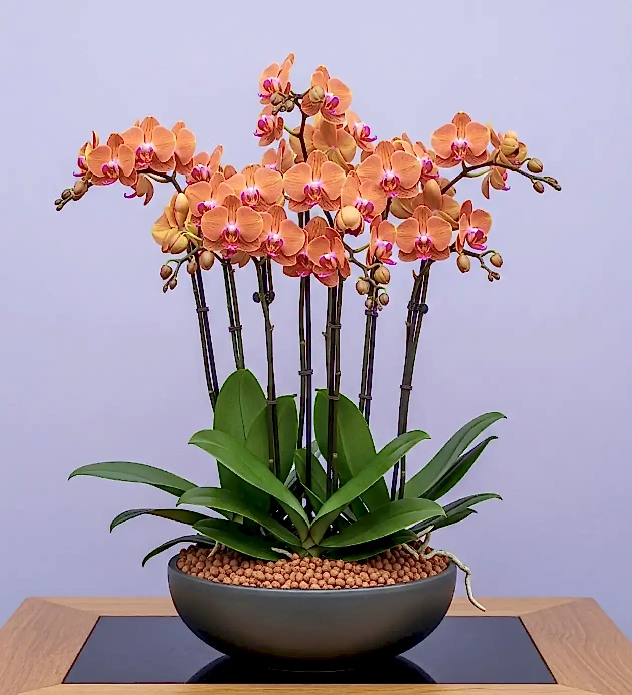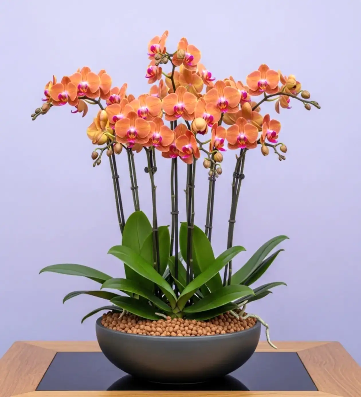 Canlı ve enerjik turuncu tonlara sahip bu 6 dallı orkide, doğanın zarafetini ve modernliğini bir araya getiriyor. Siyah seramik saksı içinde sunulan bu özel tasarım, hem ev hem ofis ortamları için şık bir tamamlayıcıdır. Orkidelerin merkezindeki pembe ton geçişleri ise dikkat çekici bir kontrast oluşturur.