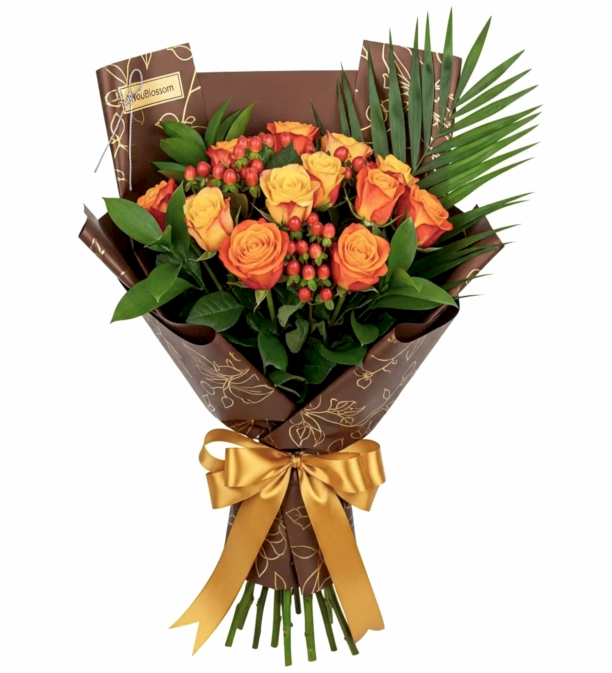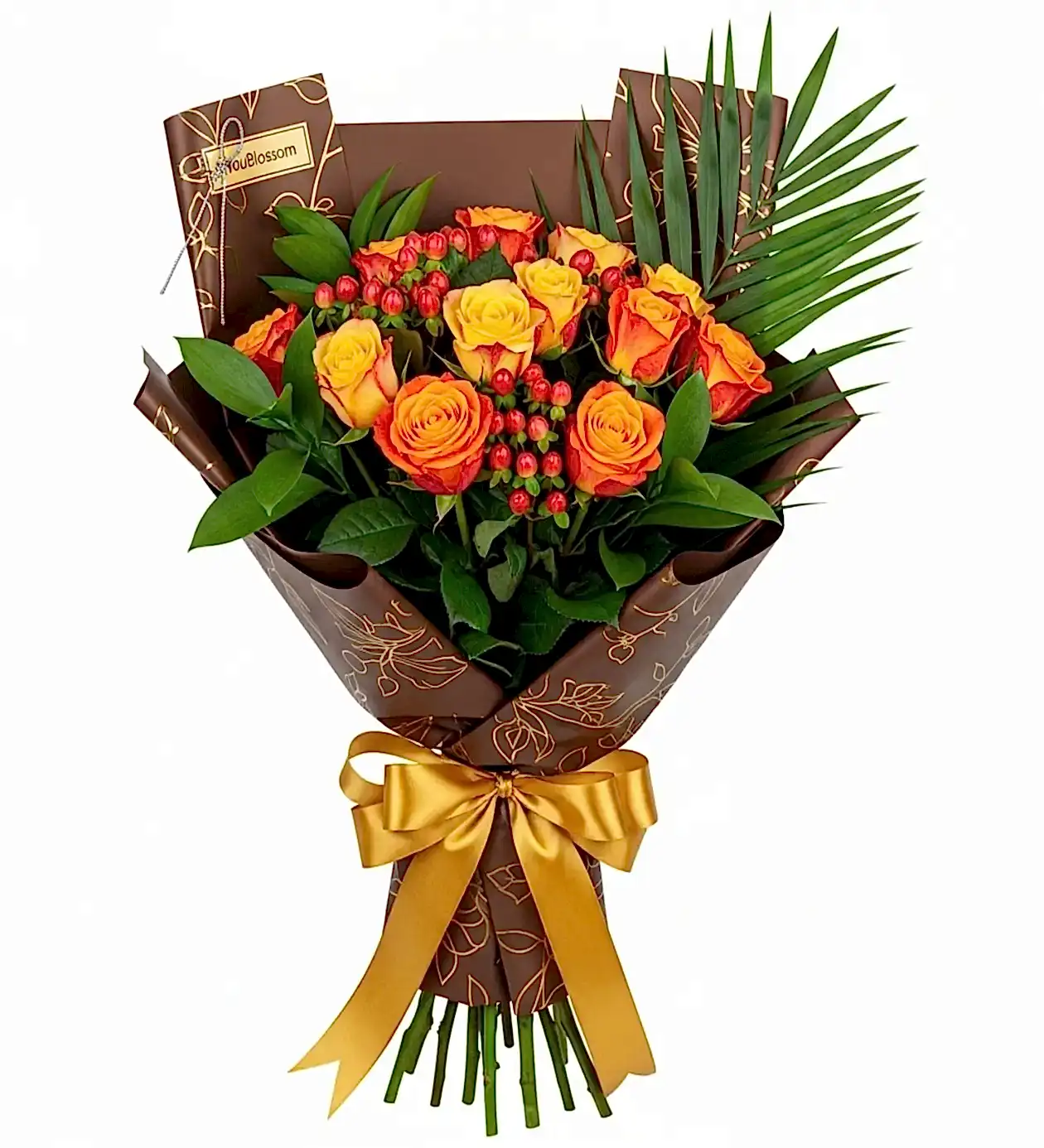 Güneşin en sıcak tonları şimdi çiçeklerle buluşuyor! Turuncu Işıltı, enerji dolu renkleri ve zarif detaylarıyla gören herkesi büyüleyen bir çiçek buketi. Parlak turuncu güller, altın sarısı güller ve kırmızı taneleriyle dikkat çeken hiperikum meyveleri, tropikal bir zarafeti yansıtıyor.