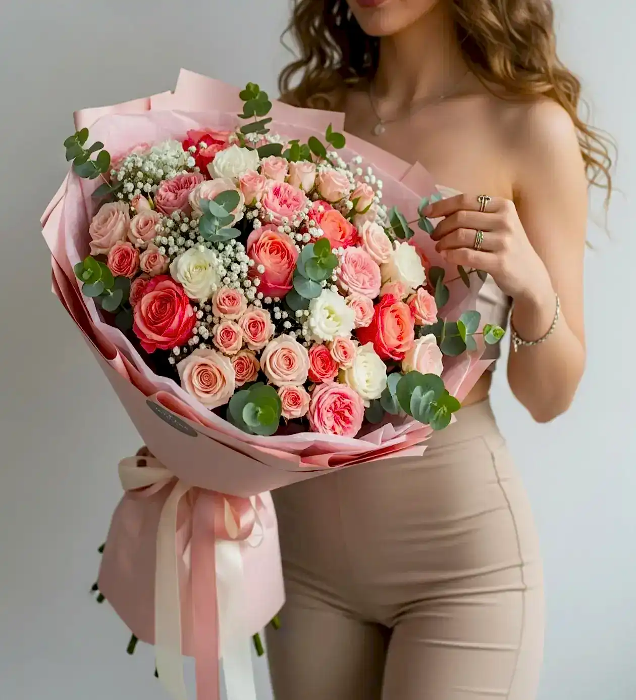 Ton uyumunu vurgulayan pastel pembe kâğıt sargı ve saten kurdele