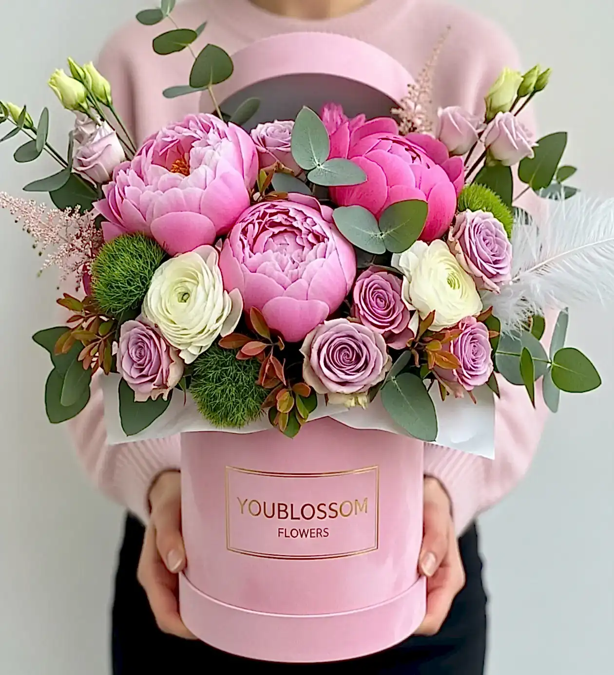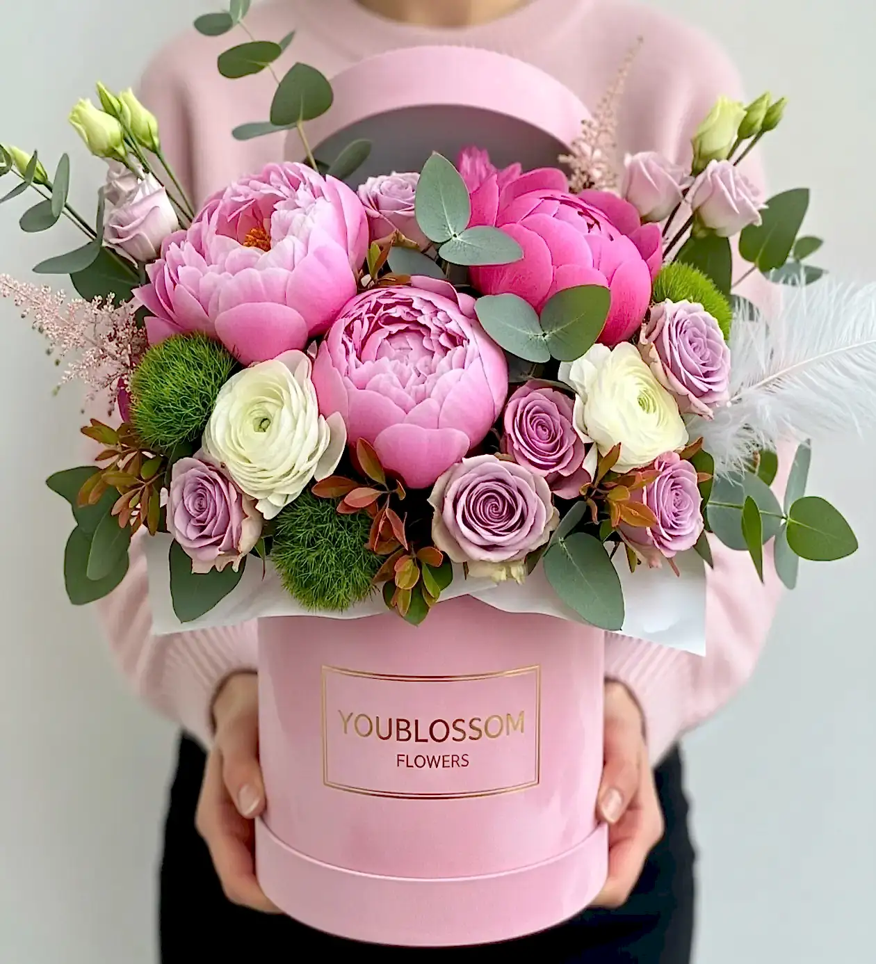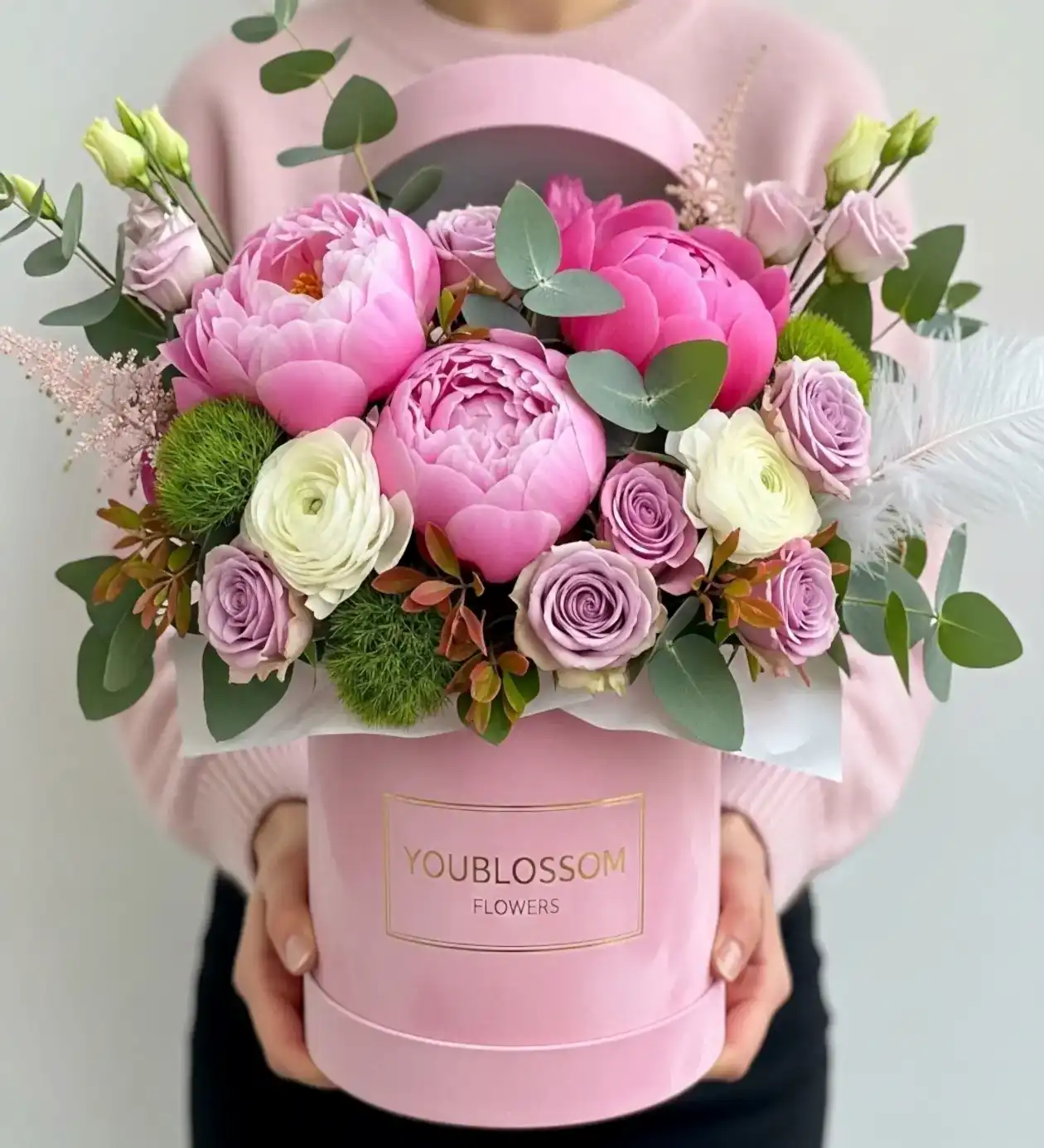 Pembe Düşler isimli bu özel kutulu aranjman, lüks çiçekçiliğin en romantik halidir. En taze şakayık, pastel tonlarda lila güller, kremsi beyaz ranunkulus çiçekleri ve yeşil dokulu tamamlayıcı yapraklar; sevgi dolu bir sunuma dönüşüyor. Şık pembe silindir kutuda sunulan bu aranjman, hem klasik hem modern bir çiçek hediyesi arayanlar için ideal.