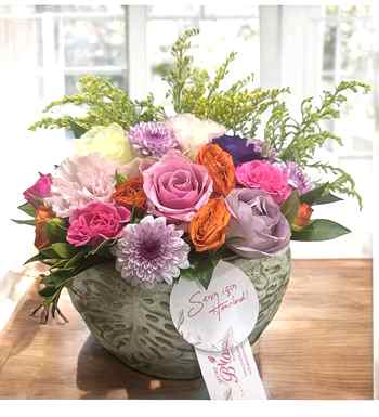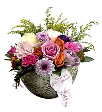 Pink Art Sweetheart içerisinde pembe gül, lisyantus, renkli papatya ve solly mevcut olup uzman çiçek tasarım ekibimizin sizler için yakınlarınızın özel günlerinde harika bir hediye fırsatı sunmaktadır.
