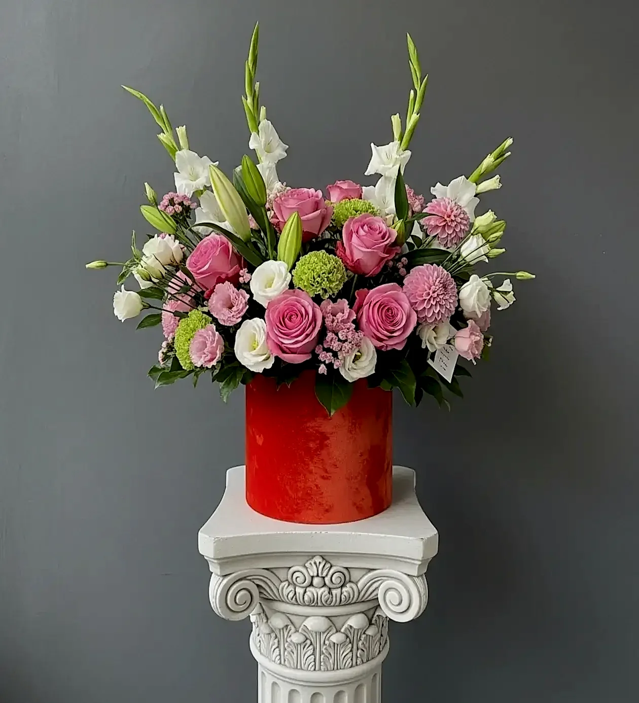 Kırmızı silindir kutuda özenle hazırlanan bu aranjman; doğum günleri, yıldönümleri, anneler günü, teşekkür hediyesi veya romantik sürprizler için mükemmel bir seçimdir.