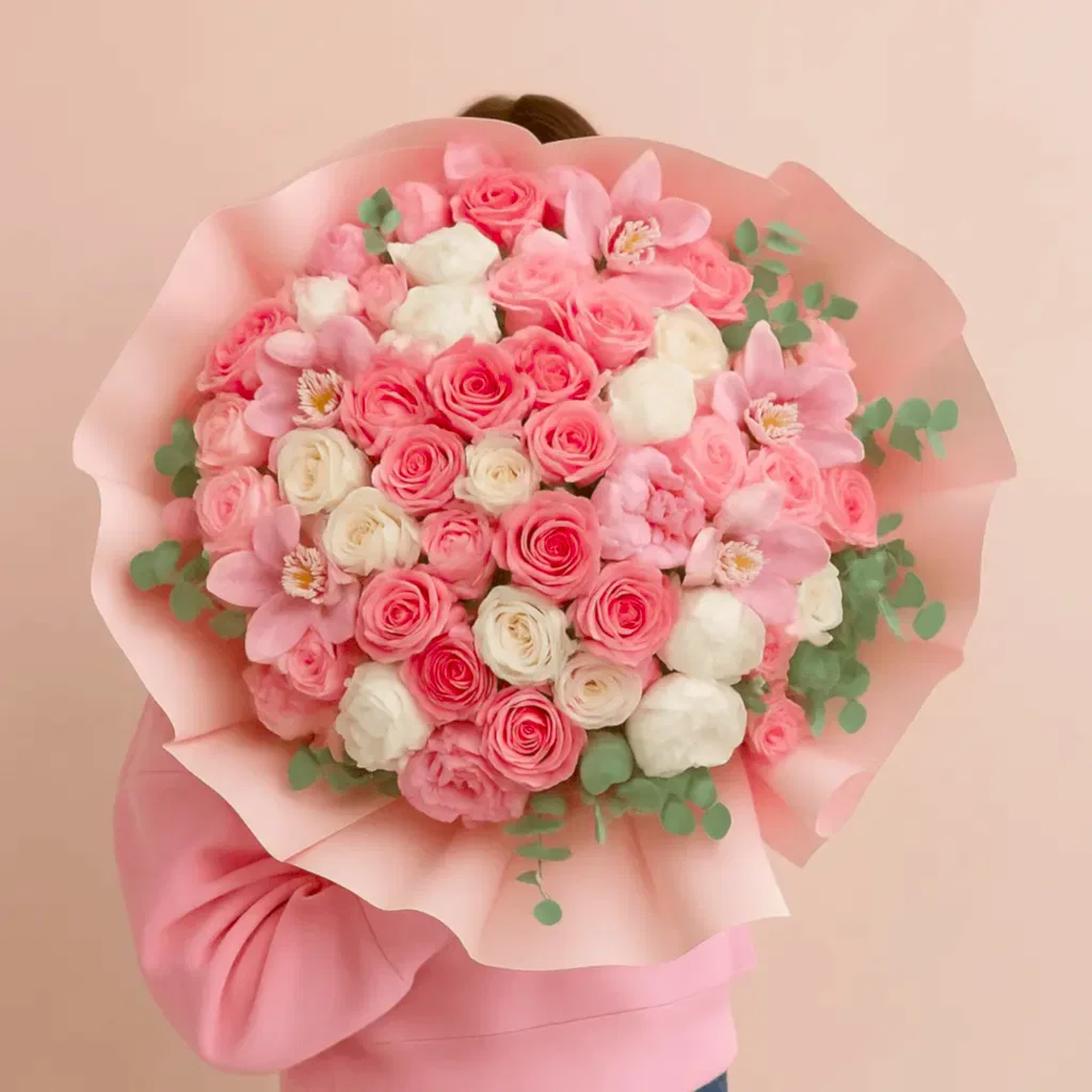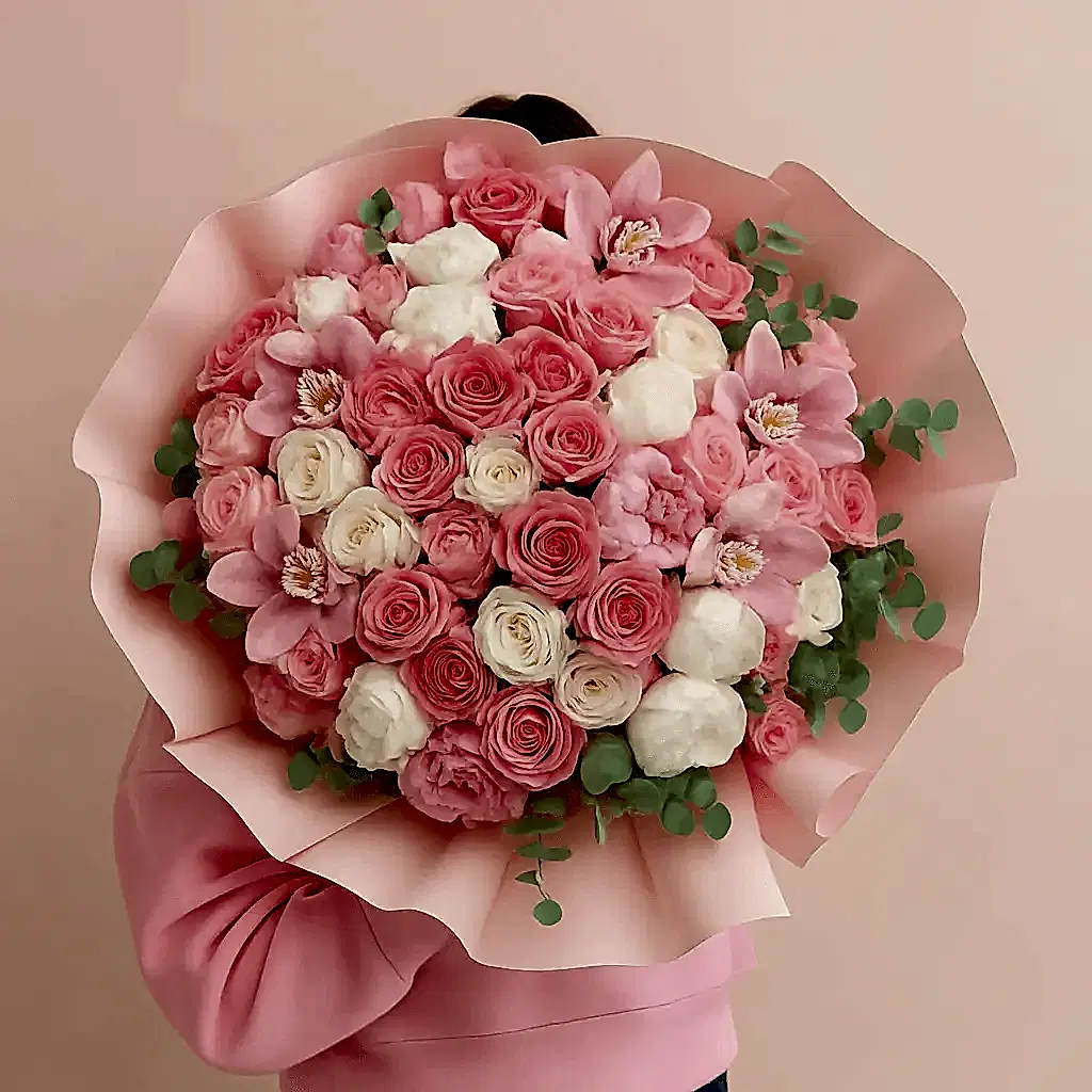 Zarif pembe güller, krem beyaz güller, romantik şakayık çiçekleri ve egzotik orkide dokunuşlarıyla hazırlanan bu büyük boy çiçek buketi, yumuşak pembe tonlu geniş buket ambalajı ile sunuluyor. Geniş hacmi, zengin çiçek çeşitliliği ve pastel uyumu sayesinde bu aranjman hem şık hem de duygusal bir anlam taşır.