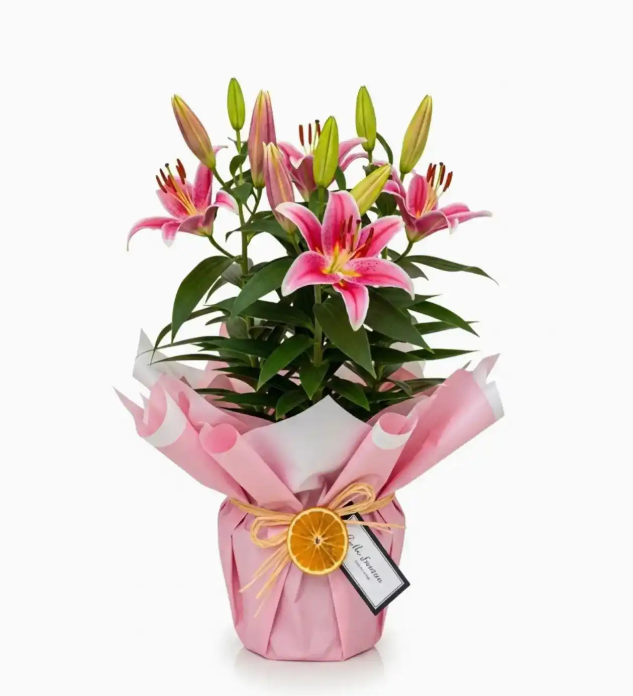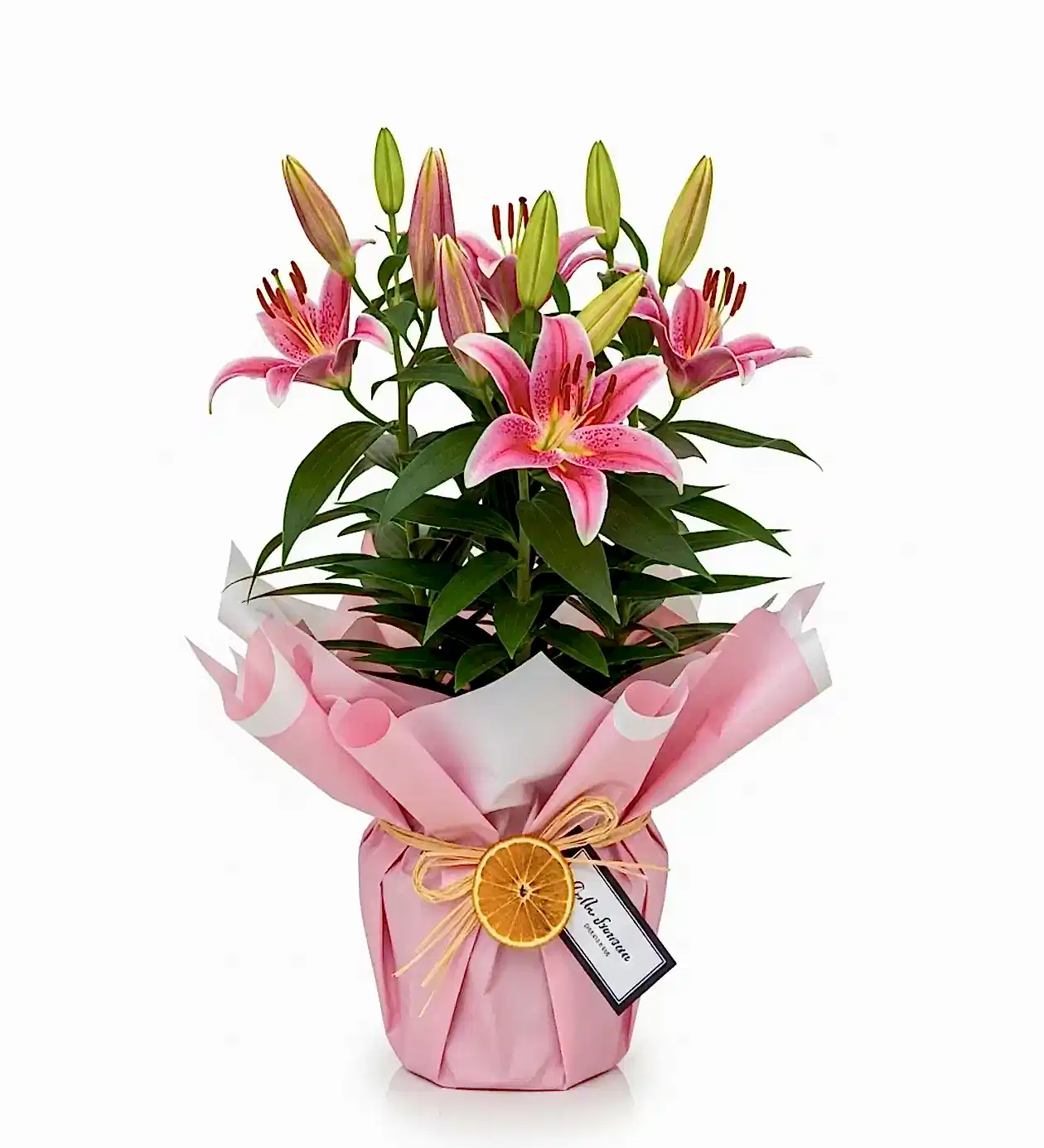 Doğallığı ve zarafetiyle göz kamaştıran Pembe Zambak Saksı Çiçeği, hem dekoratif hem de duygusal anlam taşıyan kalıcı bir hediye alternatifi sunar. Açmış çiçekleriyle dikkat çeken bu özel bitki, koyu renkli beneklerle süslenmiş canlı pembe taç yapraklara ve iç kısımlarında turuncu-kırmızı erkek organlara sahiptir. Henüz açmamış tomurcuklar, çiçeğin gelişimini sürdürdüğünü gösterir.