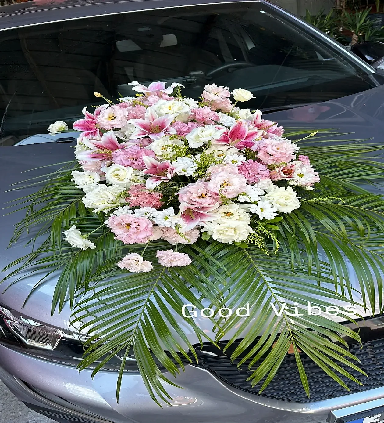 Düğün gününüzde her detayı unutulmaz kılmak istiyorsanız, aracınızın önünü süsleyecek bu premium gelin arabası çiçeği tam size göre! Pembe lilyumlar, beyaz lisyantuslar, karanfil ve ortanca çiçeklerinin romantik uyumu; tropikal yeşilliklerle tamamlanarak göz kamaştırıcı bir görünüm sunar. Özellikle gümüş ve beyaz tonlardaki araçlarla mükemmel bir uyum sağlar.
