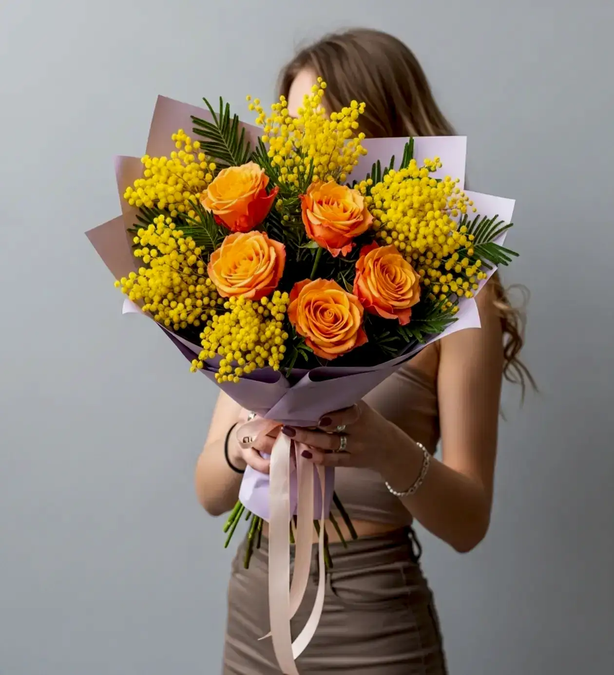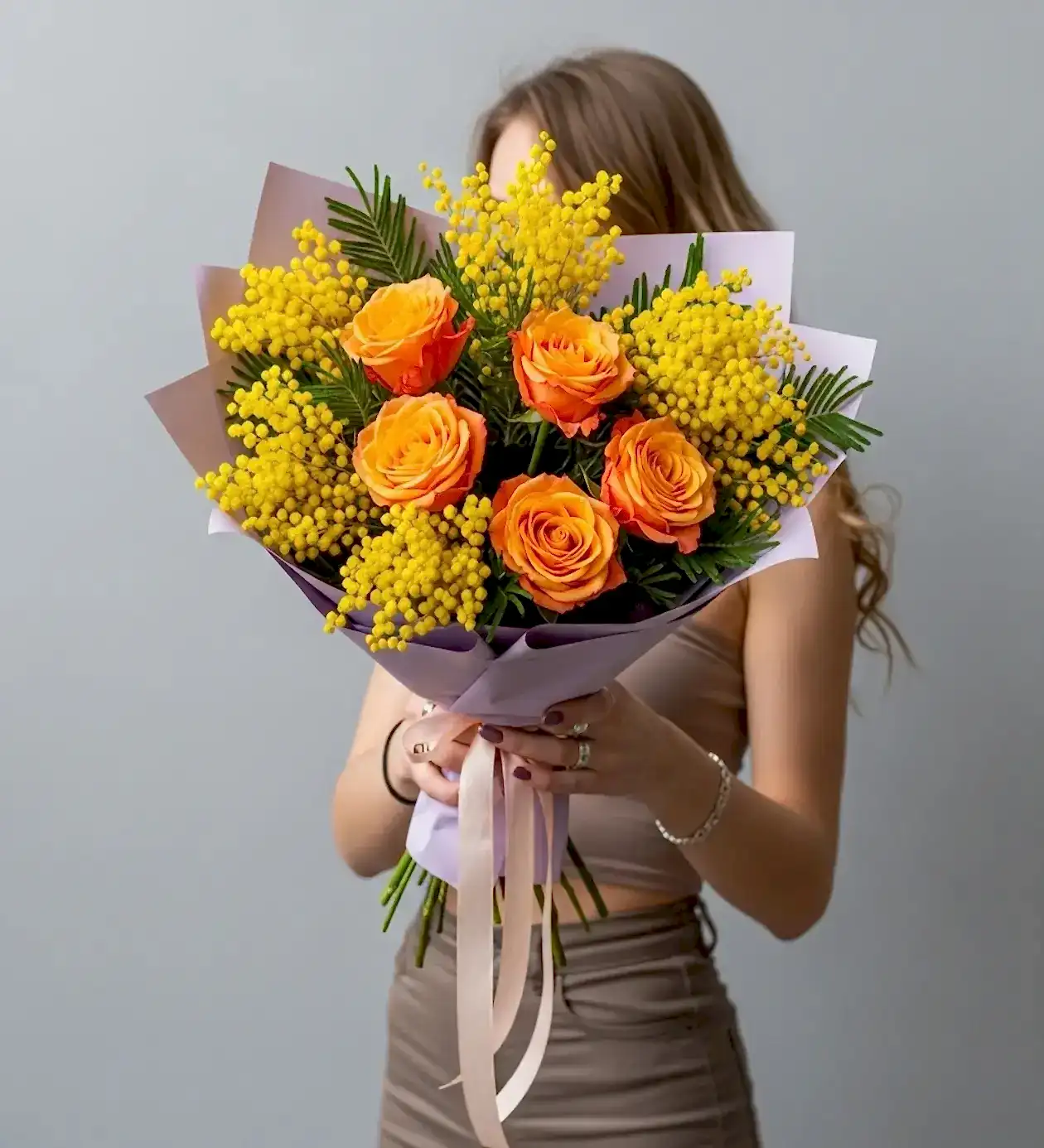 Bu göz alıcı tasarımın kalbinde; yaşam enerjisini, coşkuyu ve yaratıcılığı temsil eden kusursuz turuncu güller yer alıyor. Güllerin sıcaklığı, aralara serpiştirilen pofuduk sarı mimozalarla birleştiğinde adeta büyüleyici bir gün batımı manzarası sunuyor. Buketi gerçek bir "Premium" esere dönüştüren detay ise ambalajıdır. Çiçeklerin sıcak tonlarıyla muazzam bir zıtlık ve lüks uyum yakalayan soft lila/lavanta renkli premium sarım, aranjmanın ne kadar iddialı bir tasarım olduğunu ilk bakışta hissettiriyor.