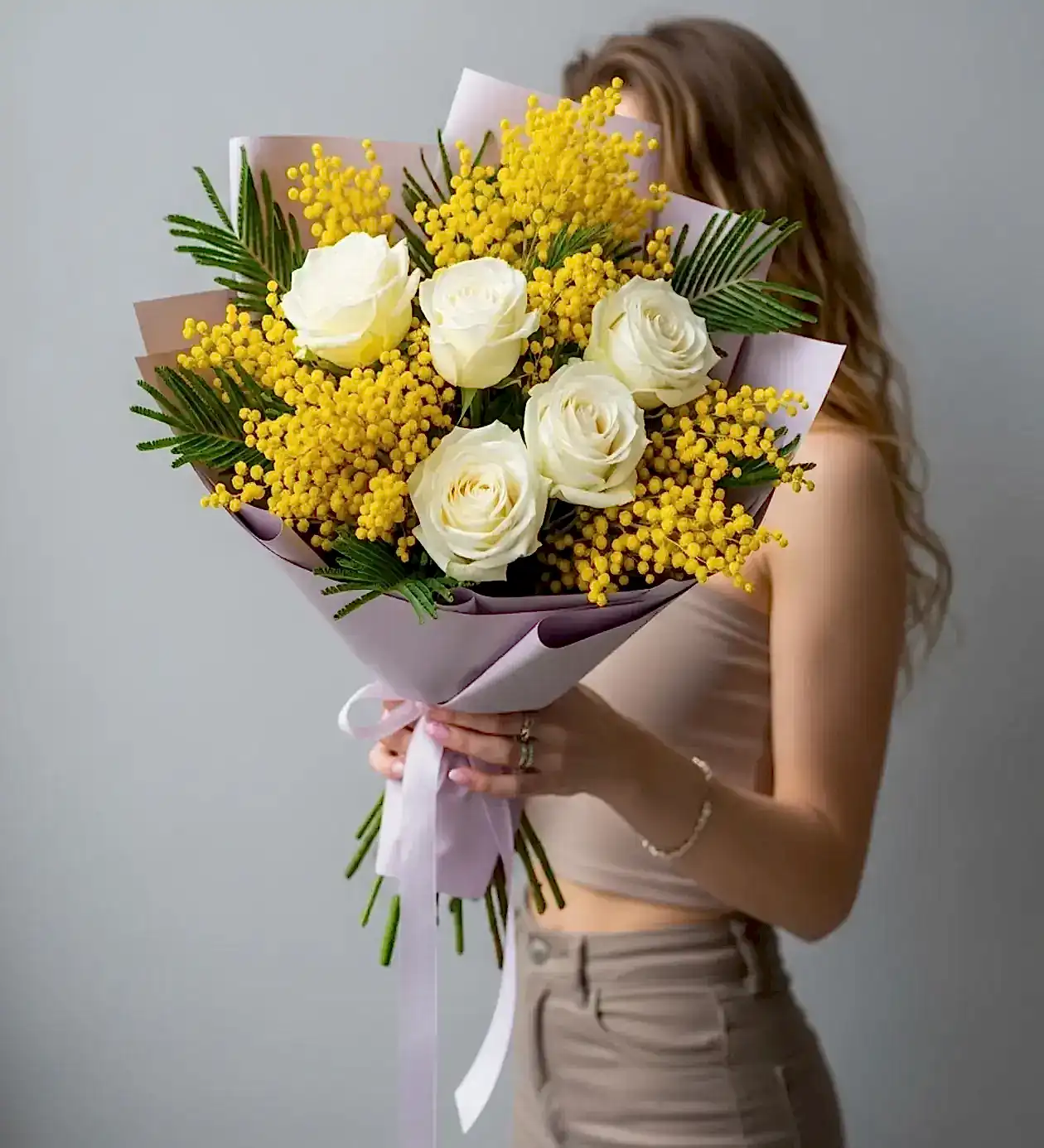 Koku ve Doku Şöleni: Mimozaların o eşsiz pudramsı kokusu ve güllerin ipeksi yaprakları, buketin sadece görsel değil, duyusal bir şölen sunmasını sağlar.