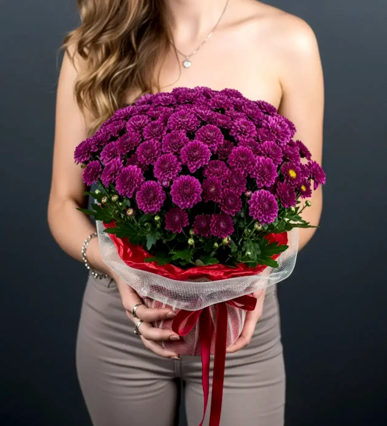 Zengin mor tonlardaki krizantemler, güçlü duyguları ve zarafeti simgelerken;